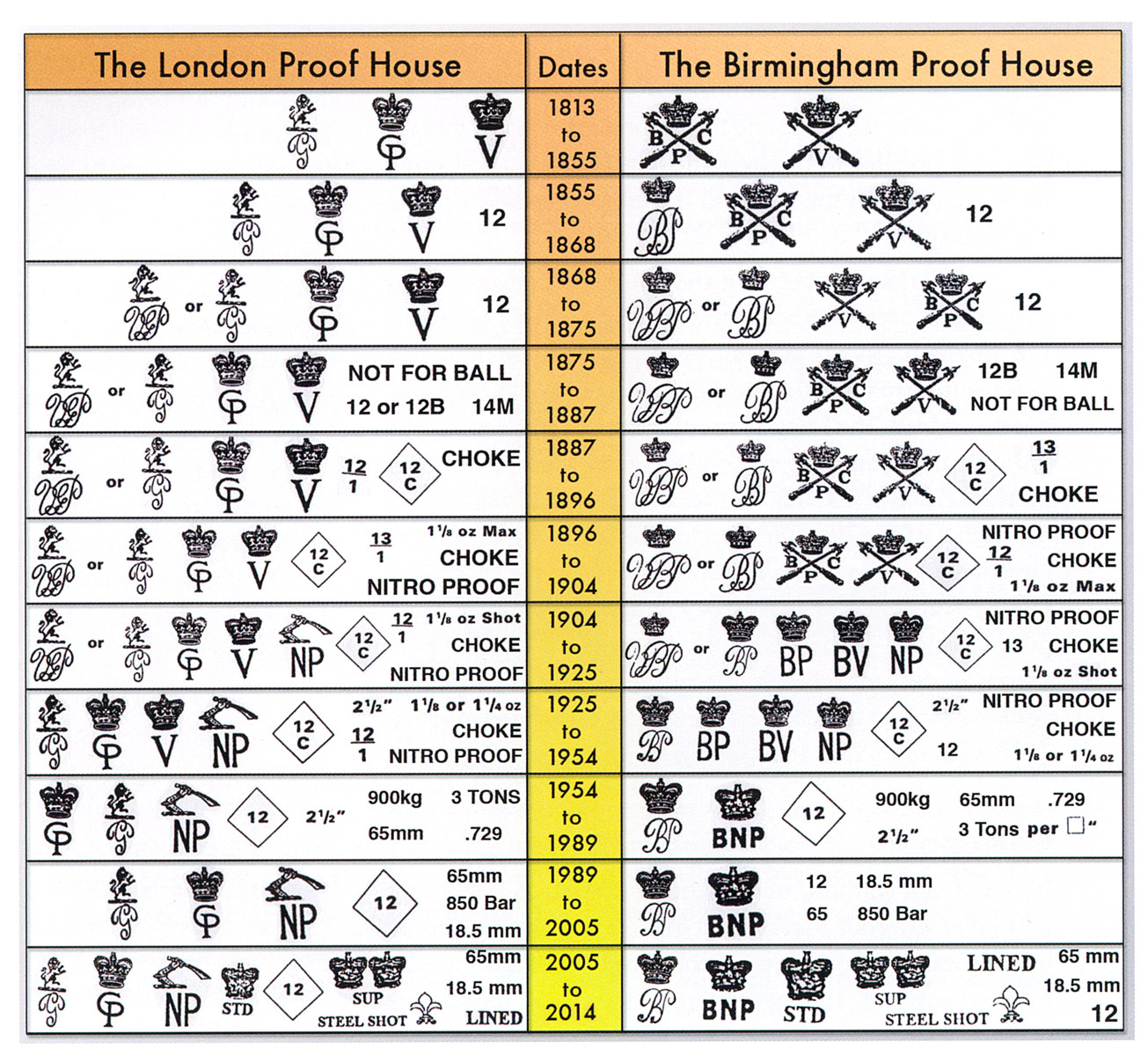Chart showing the syntax of English proofmarks in force over time---an aid in determining a gun's period of manufacture.
