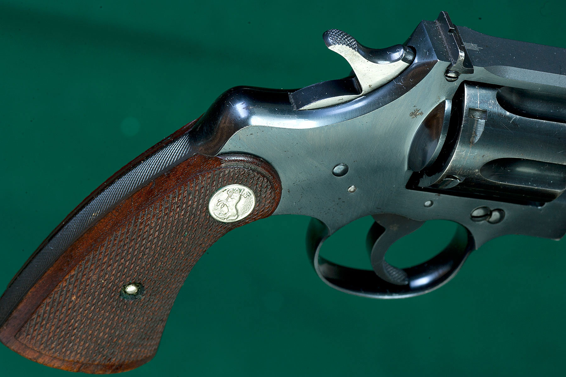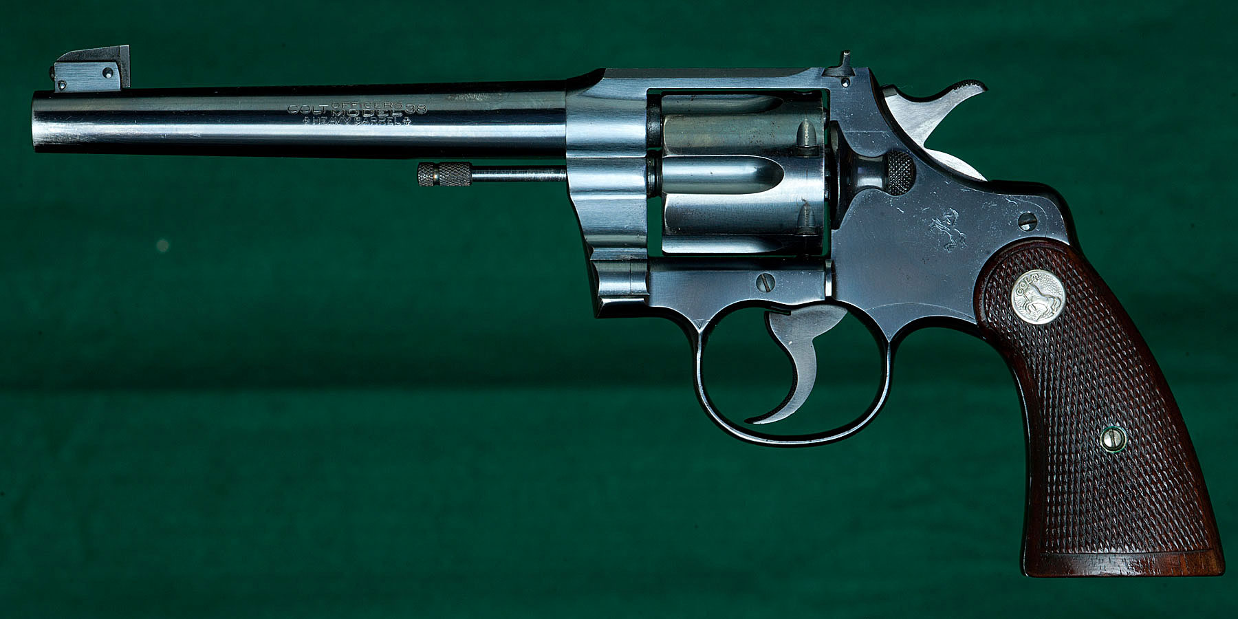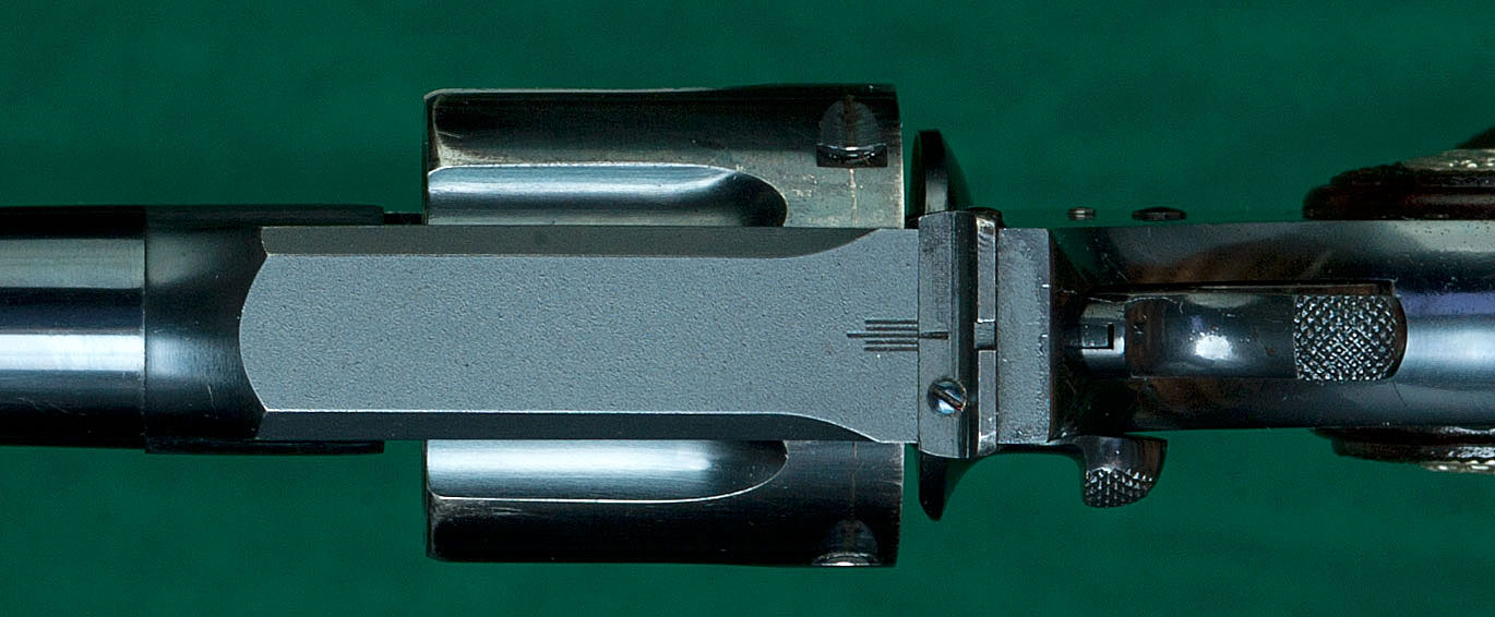 6" barrel. Matted flat-top frame with adjustable sights. Checkered hammer, trigger and backstrap. Checkered walnut medallion grips. Mfd 1950. 98%blue. $995.