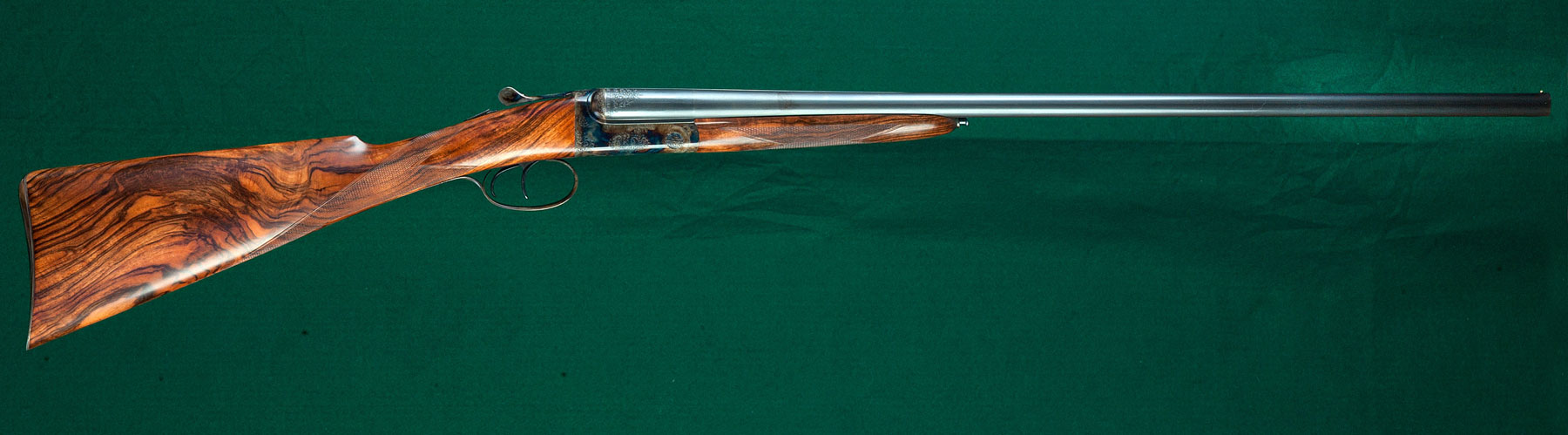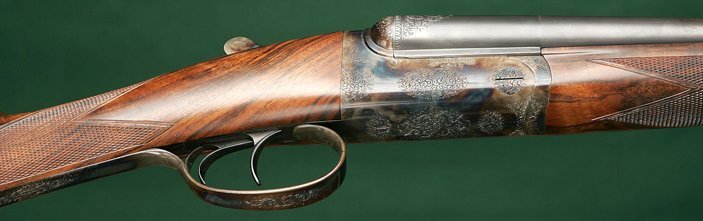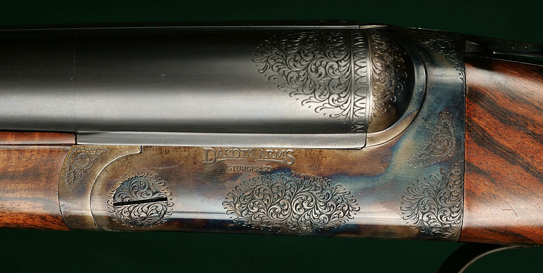27" SxS monoblock barrels with concave rib choked improved cylinder & modified, 14 1/4"pull from front trigger to engraved, casehardened steel buttplate, 1 3/8" - 2 1/2" drop. No cast. Stocked personally by Dakota founder Don Allen with highly figured walnut: straight English grip, Anson pushbutton release splinter forend and classic point-pattern checkering with mullered borders. Rose & scroll engraved, rounded, pinless, casehardened action with rolled triggerguard. Auto ejectors. Weight: 6lbs, 7oz. Not one of the later Italian-sourced actions; this gun was made entirely in the Dakota shop in Sturgis, South Dakota. Serial number 0101 --- one of the very first built. Very little used. $7995.