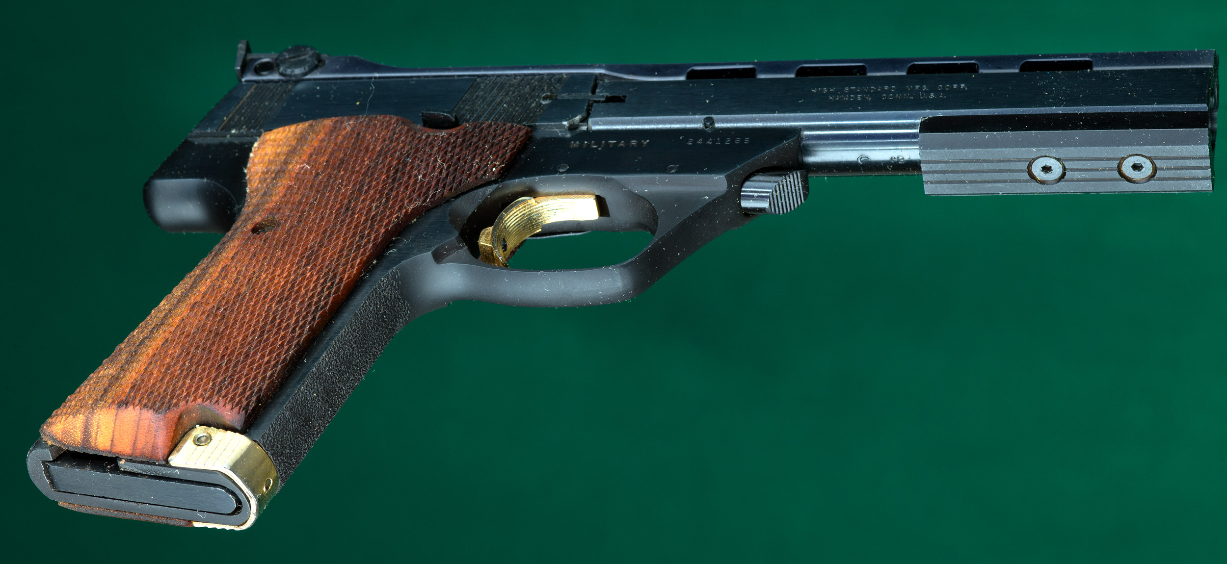 | | Checkered walnut thumbrest grips. Gold finished small parts. Hamden Mfd |