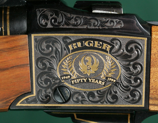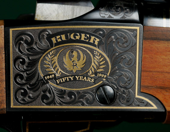 | engraved and gold inlaid action, with William Ruger's signature in gold on |