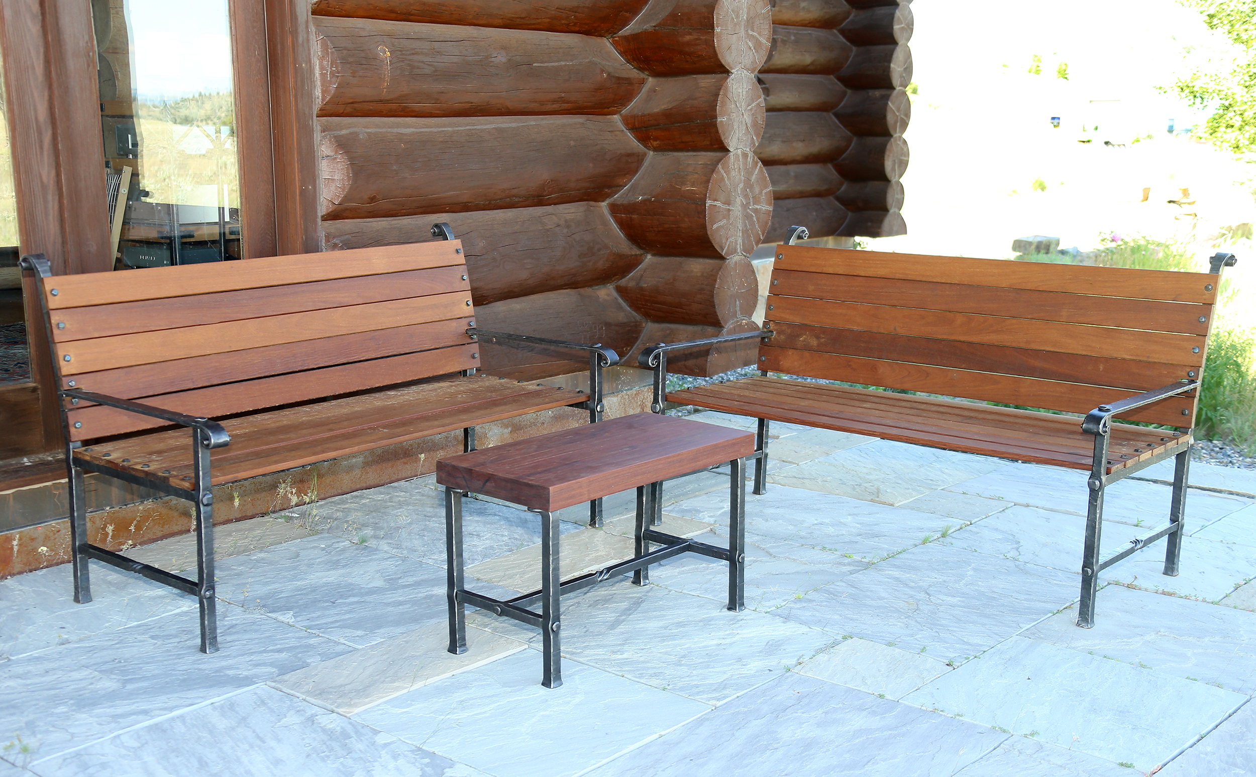 Bench. 20" x 38" x 19" High. Leg frames forged from 1 1/4" square stock. Pictured in Dona Meilach's book, Ironwork Today, Schiffer, 2006., Page 153.
