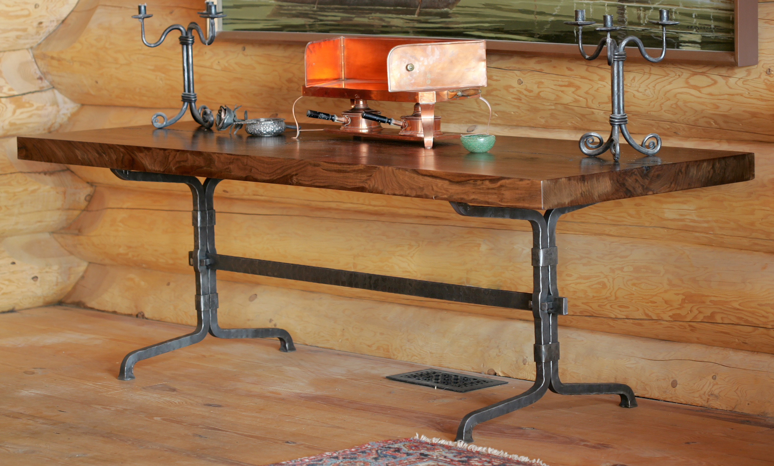 Iron trestle table, with top of one solid slice of an American black walnut tree, 96" x 34" x 3" thick. Each leg component forged from 1 1/4" square solid iron bar.