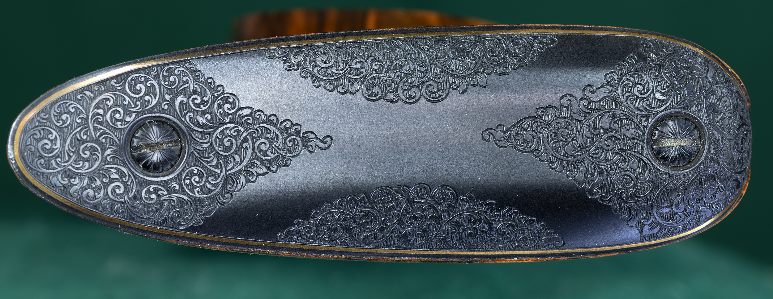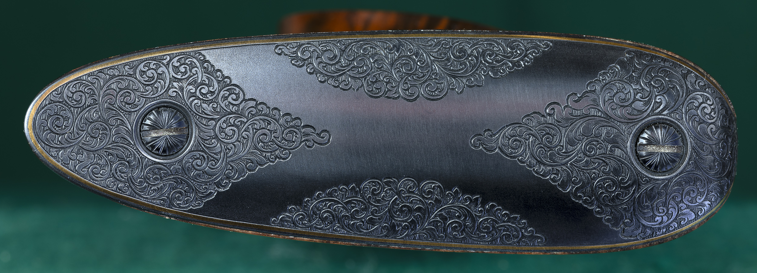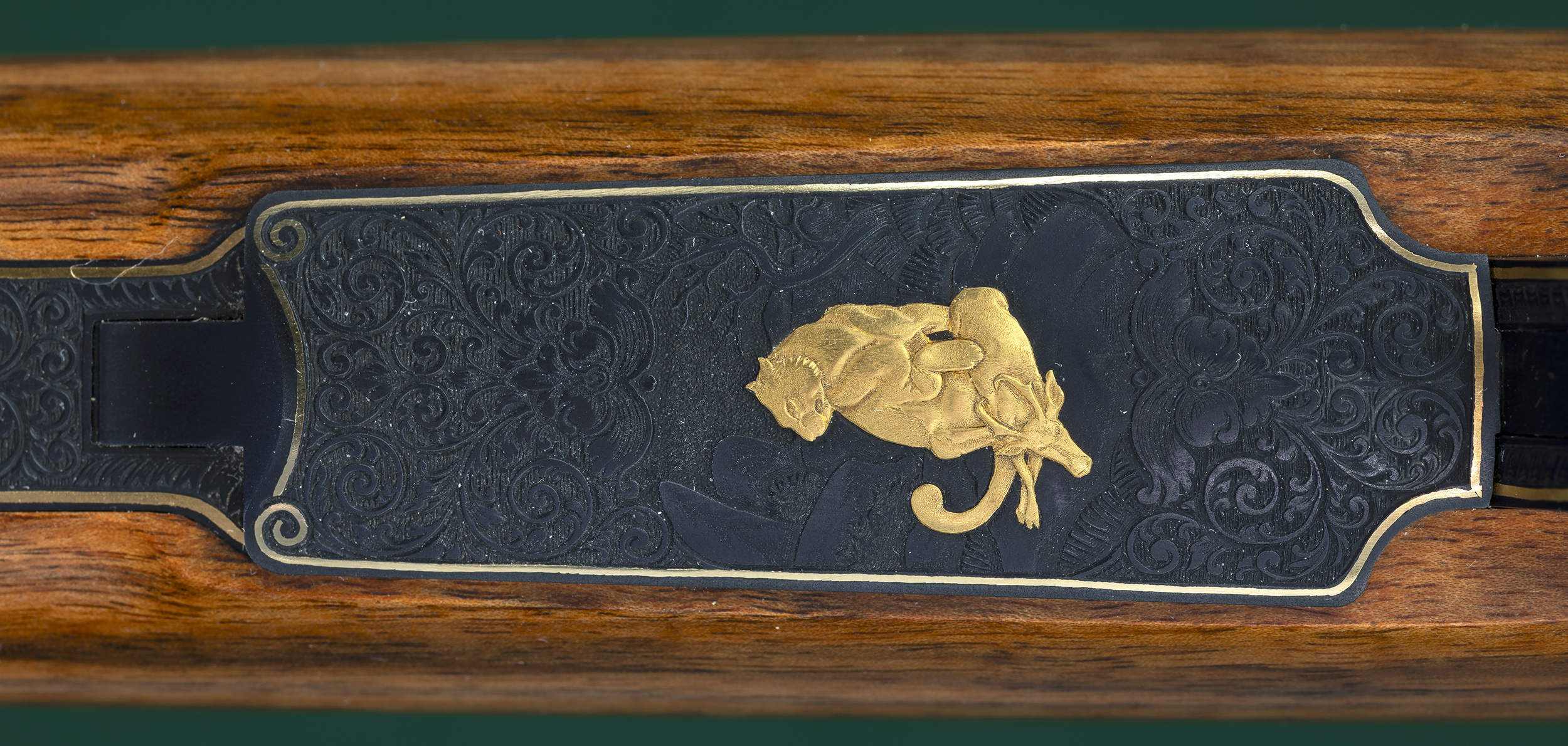 | having taken a bull elk in raised gold on the floorplate. Gold borderline work |