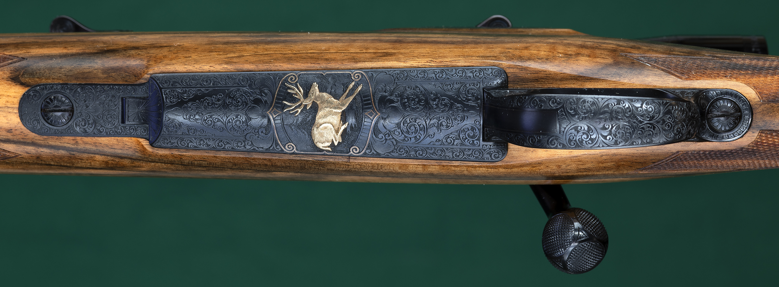 | | scope rings, buttplate, and with raised gold running buck on floorplate. |