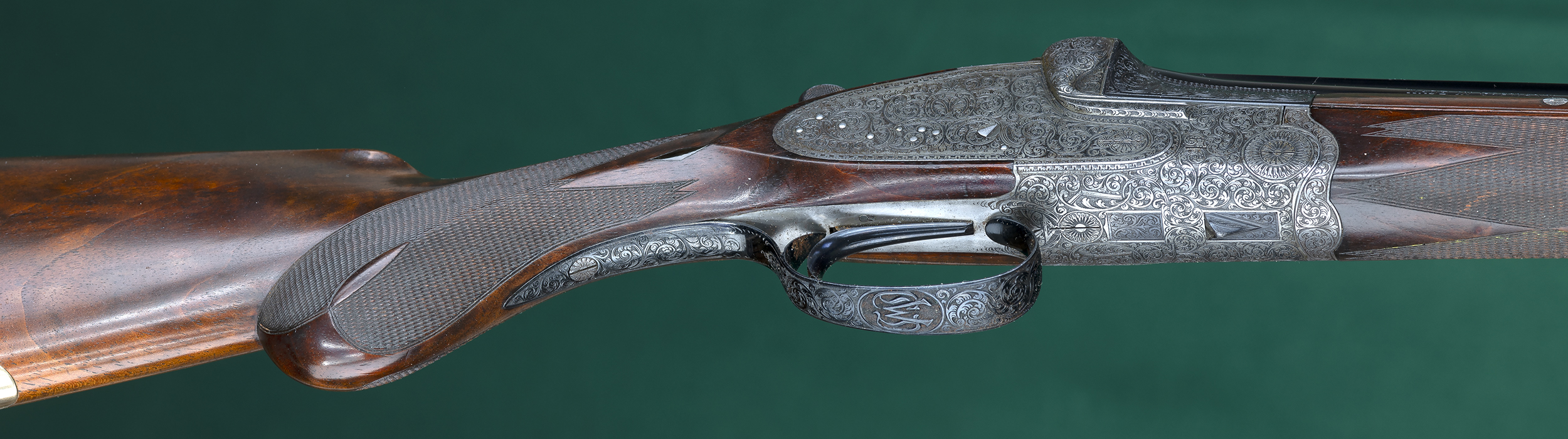 | | Deeley-release three-piece forend, point-pattern checkering, small horn |