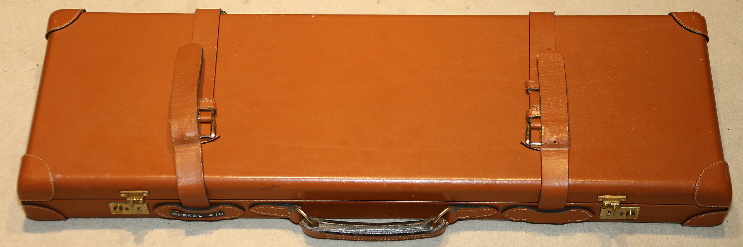 | | leather-covered trunk case with Merkel label and a pair of .410 snap caps. $14,875. |
