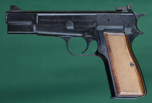 | Tapered front recoil spring plug. Checkered walnut medallion grips. Mfd  |