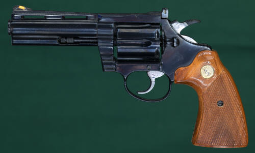 | 4 3/4" barrel. Adjustable rear sight. Blue with checkered walnut grips. Mfd  |