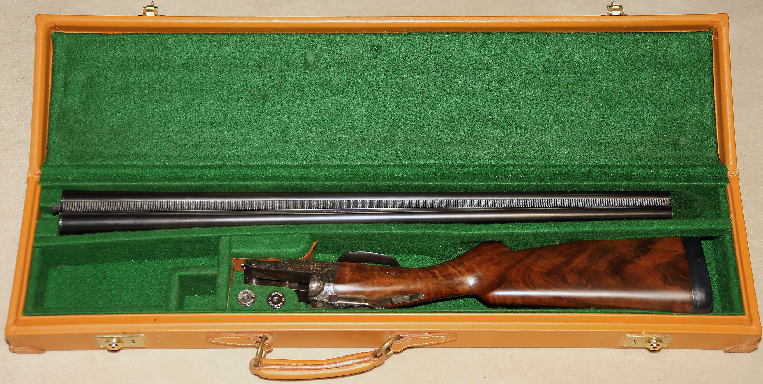 | With original leather trunk case and a pair of Parker Reproduction snap caps. $2650. |