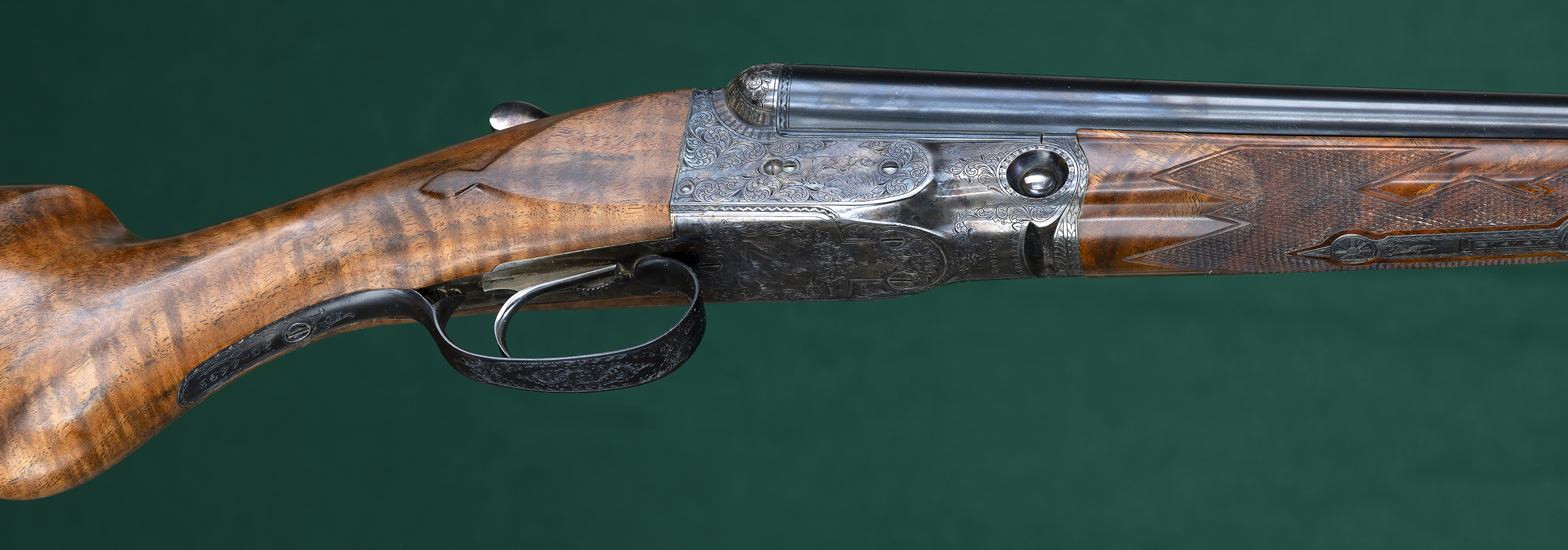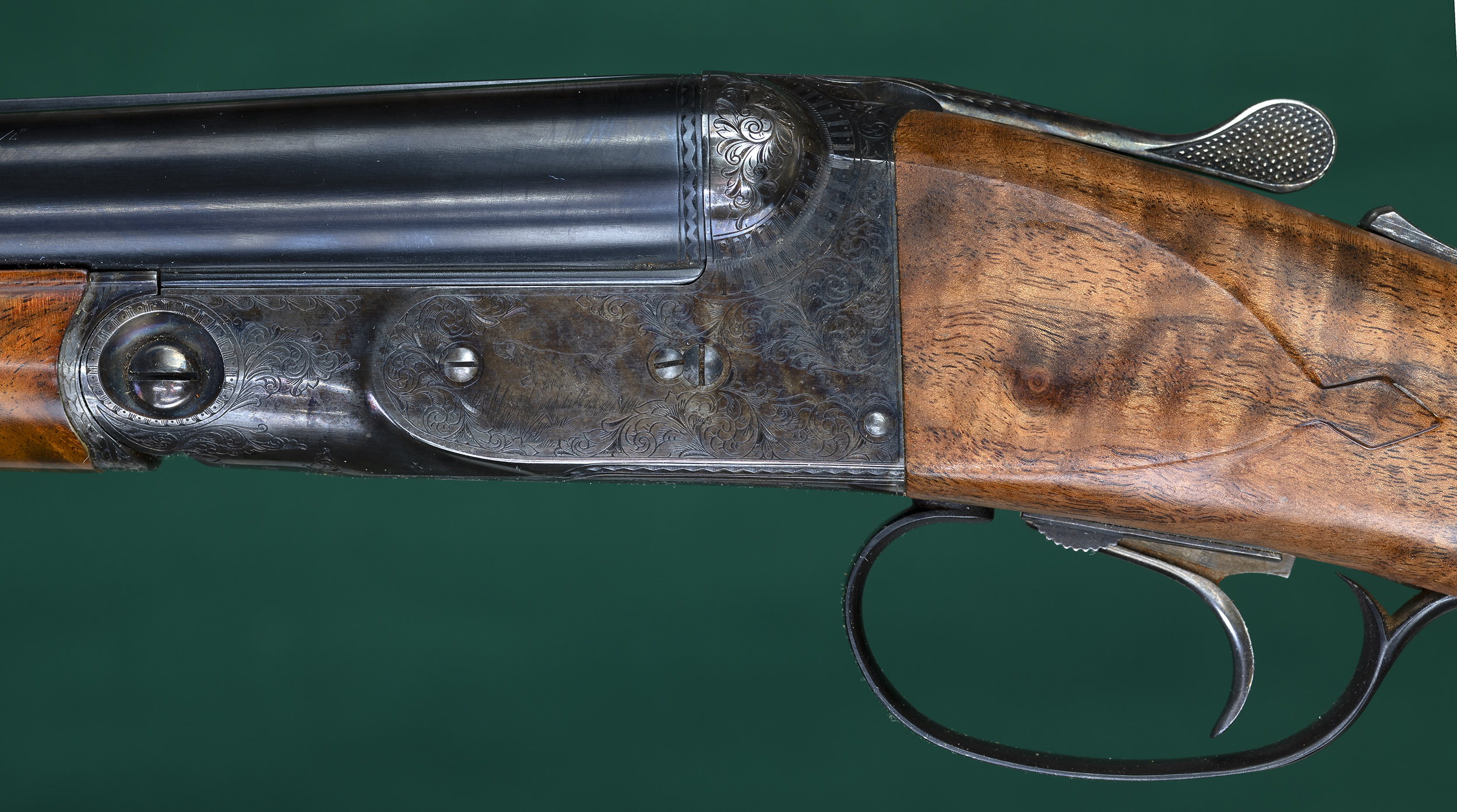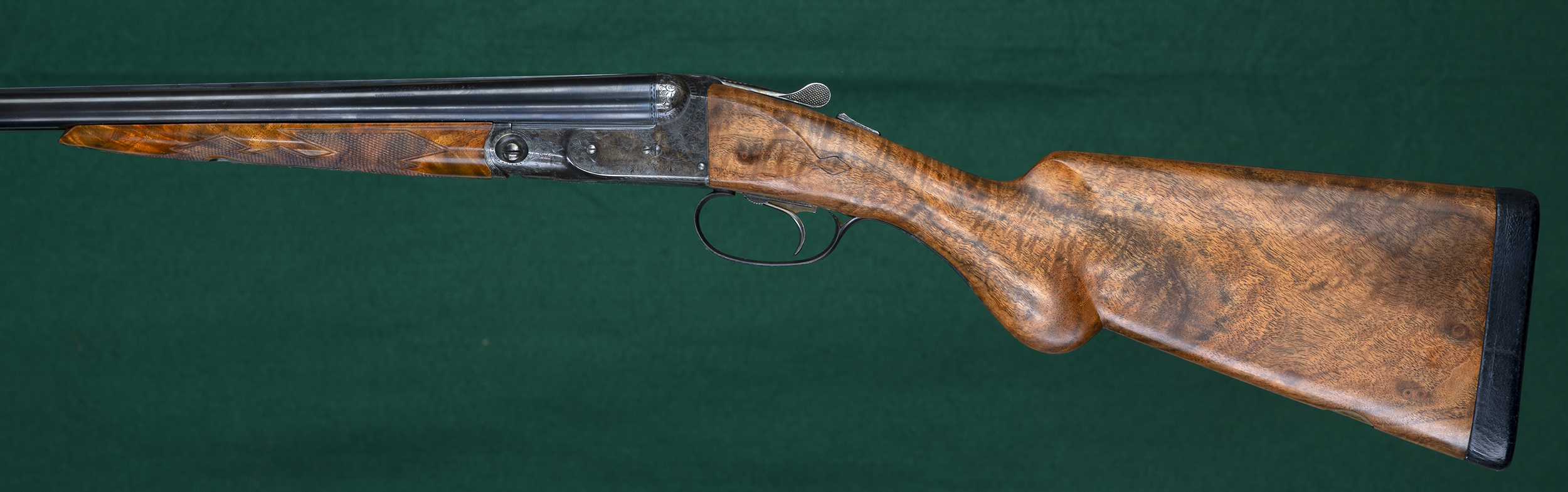 | Original splinter forend with Anson pull-down latch and point-pattern |