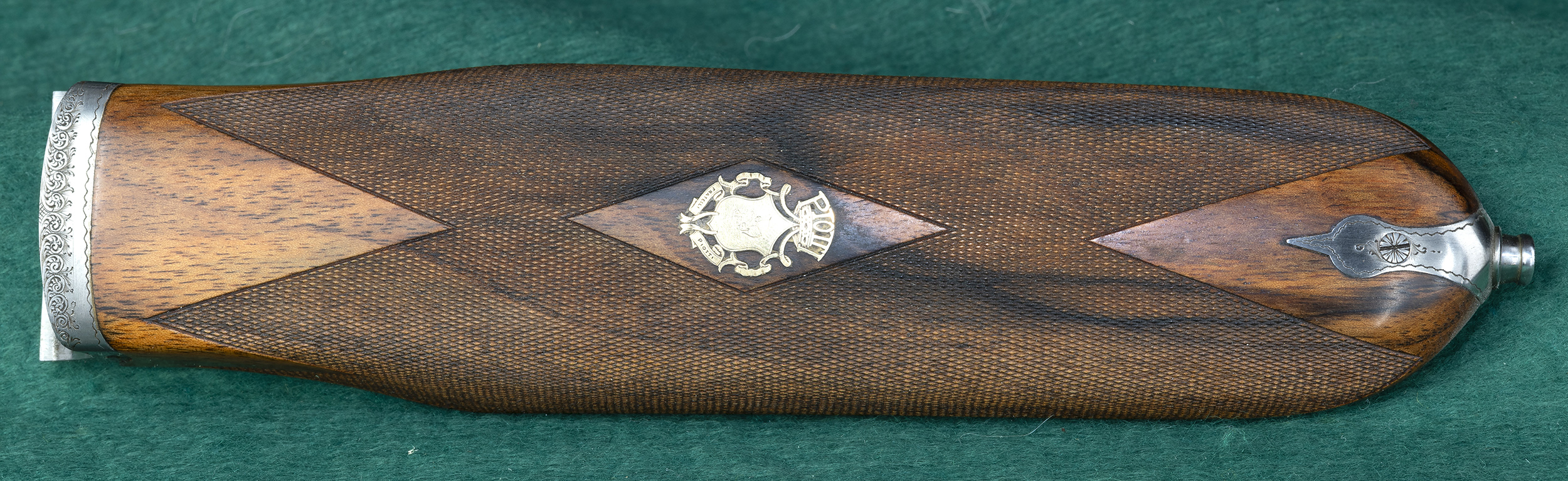 | | straight English grip and fine classic point-pattern checkering. Scalloped, |