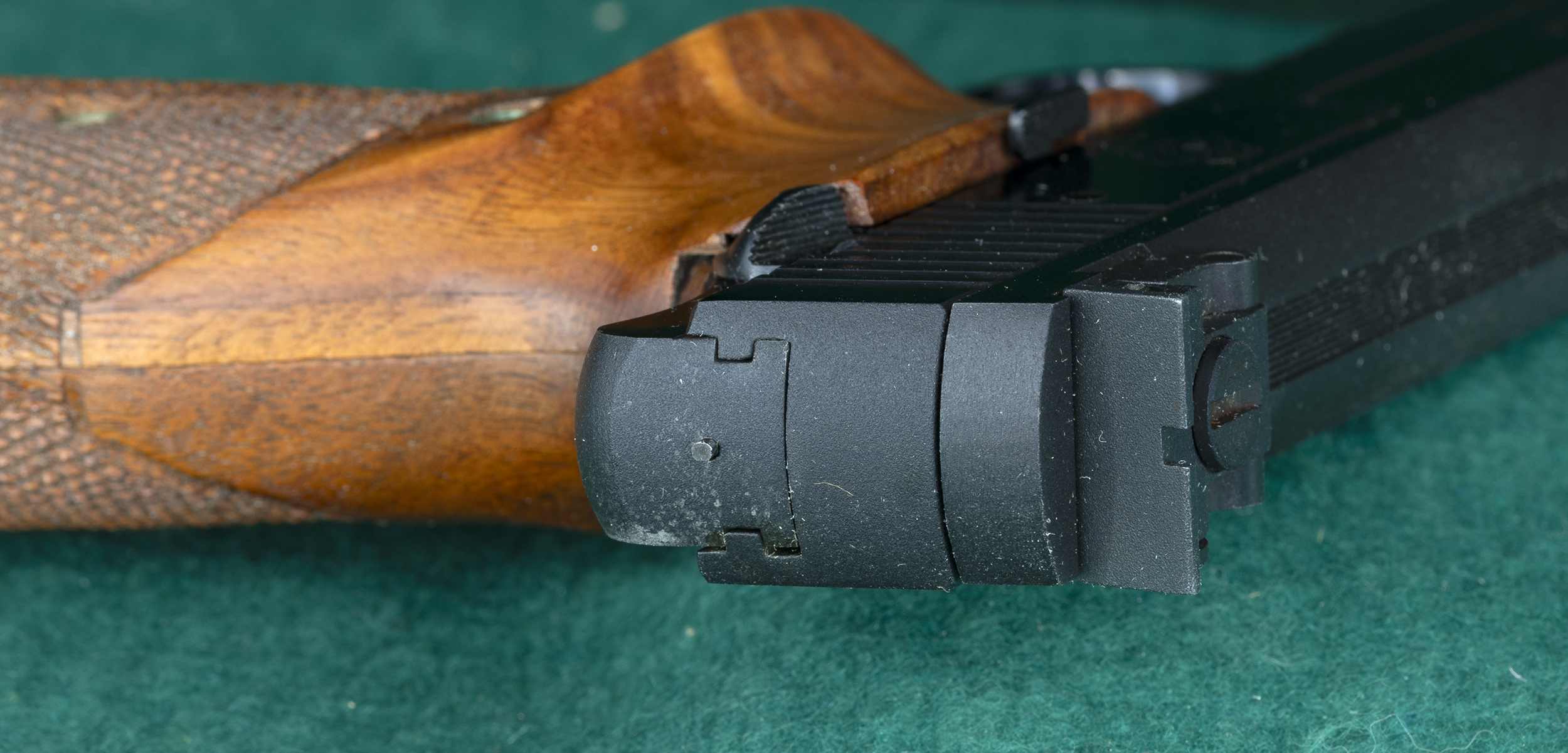 | | Wrap-around checkered walnut thumbrest grips. Early series with cocking |