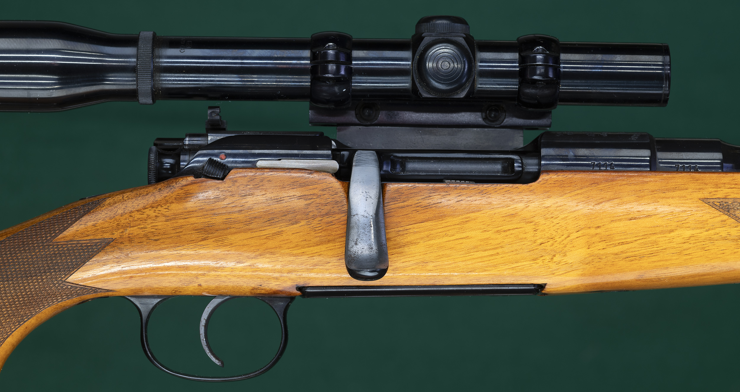 | bale, bakelite pistol grip cap, classic point-pattern checkering, classic comb, |