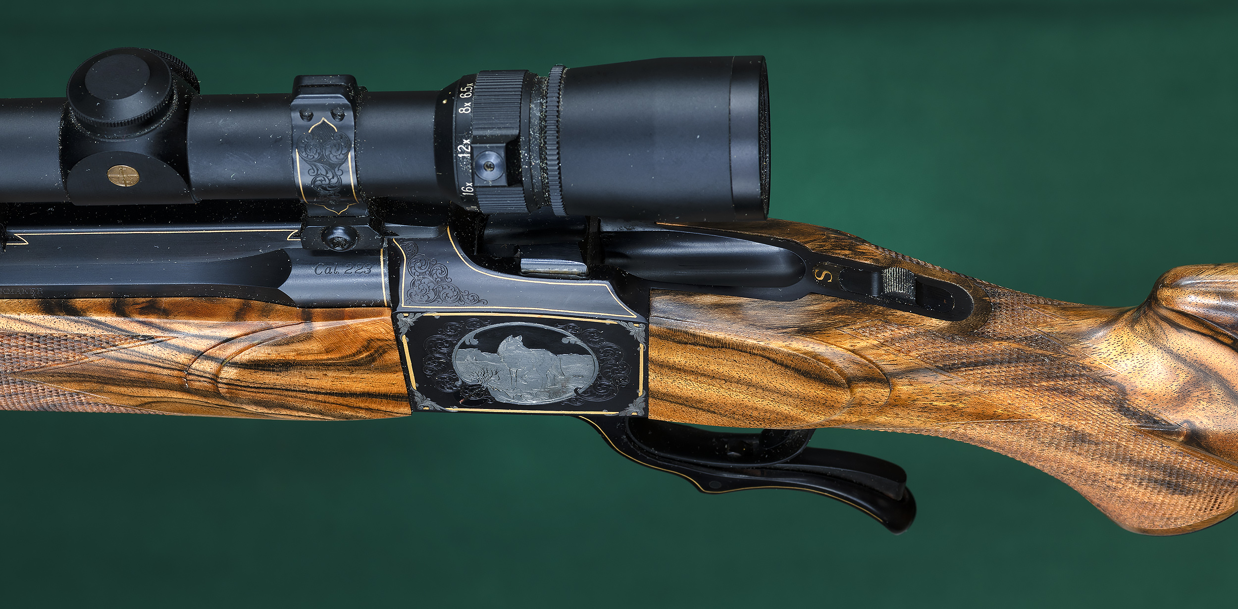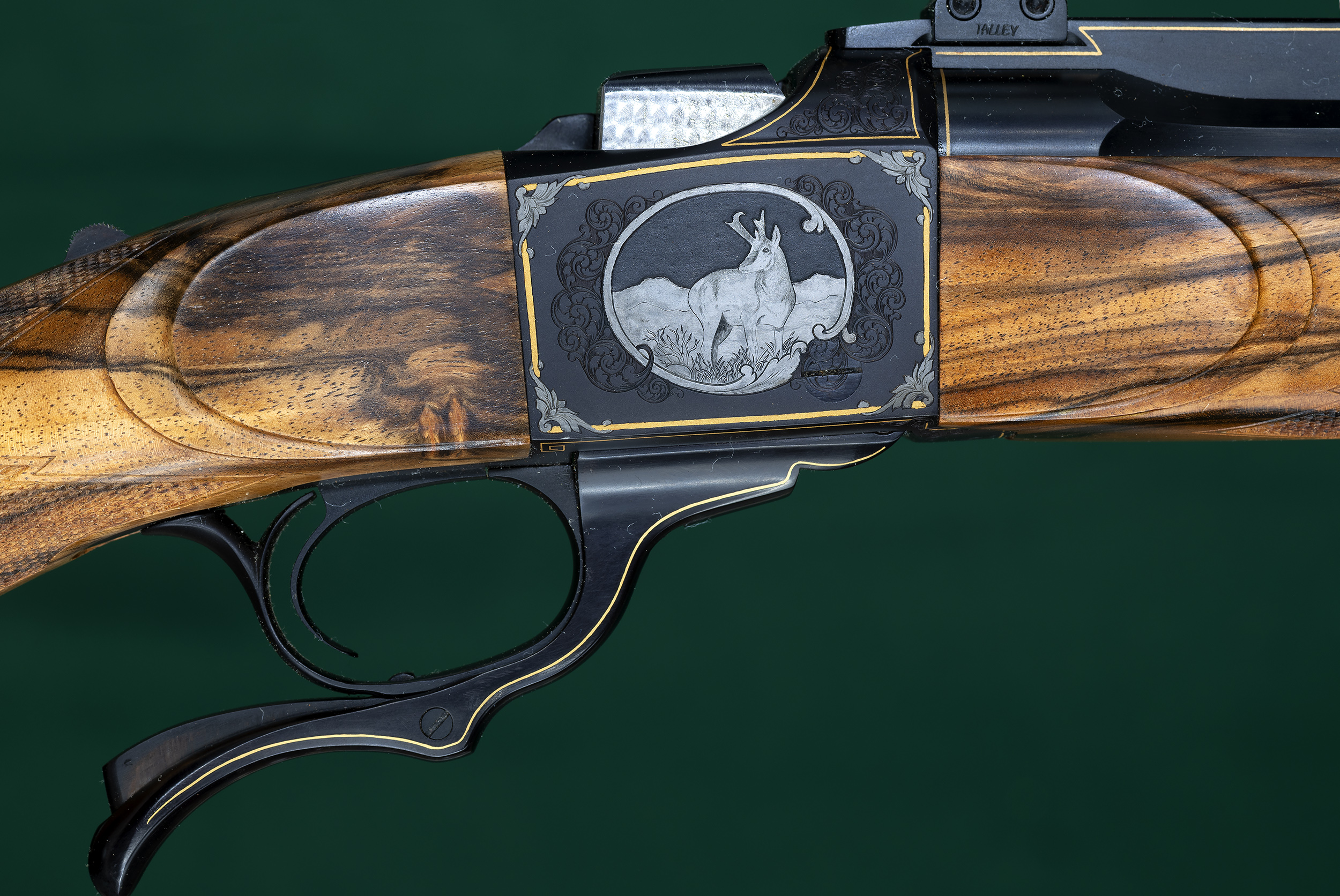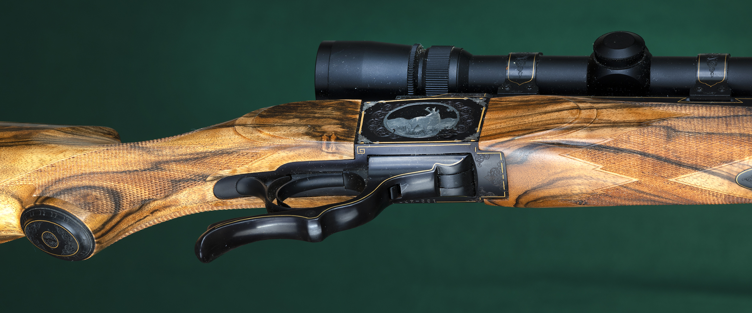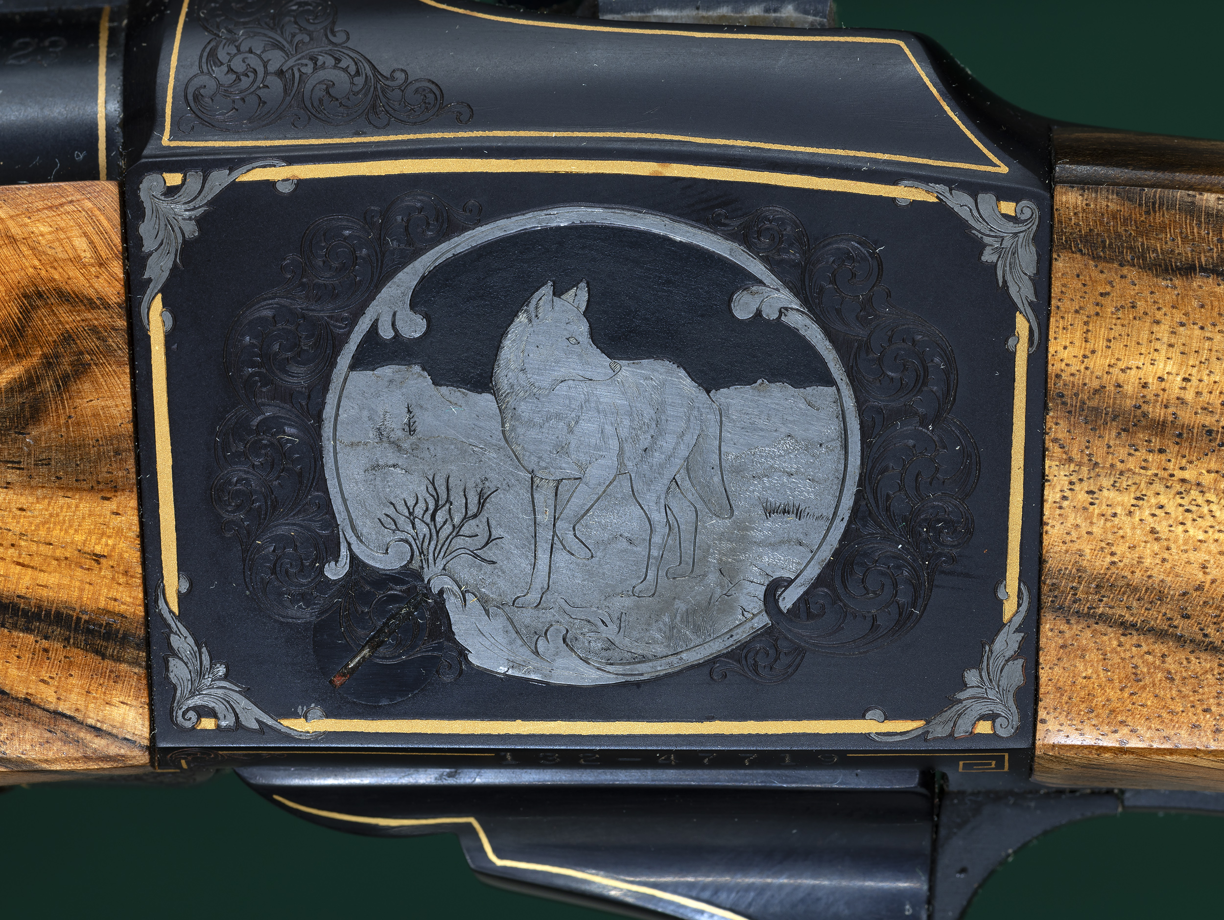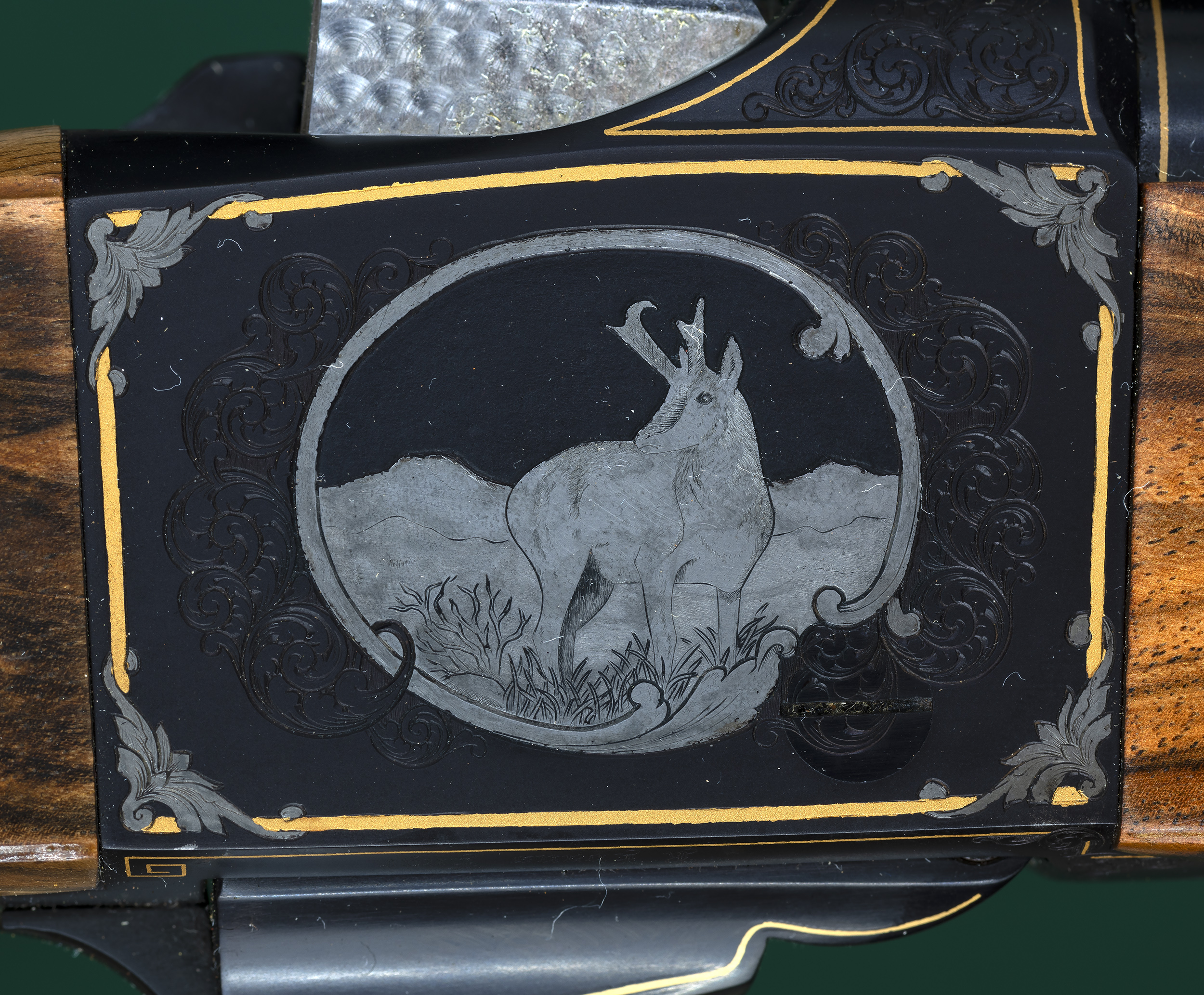 | sliding top tang safety with S inlaid in gold. Finely scroll engraved by Bob |
