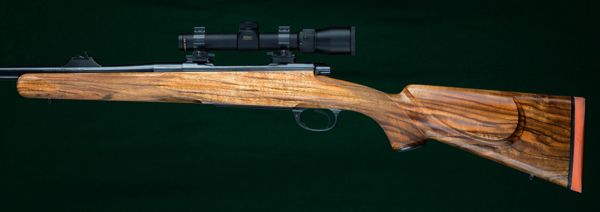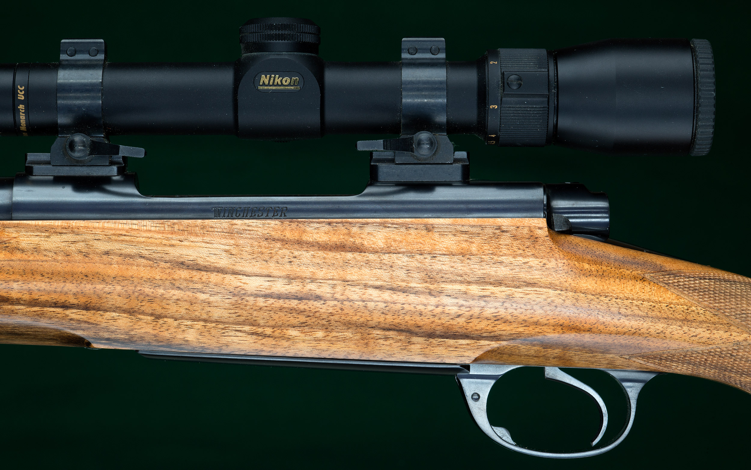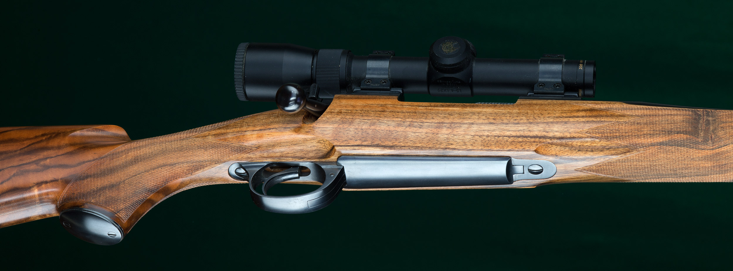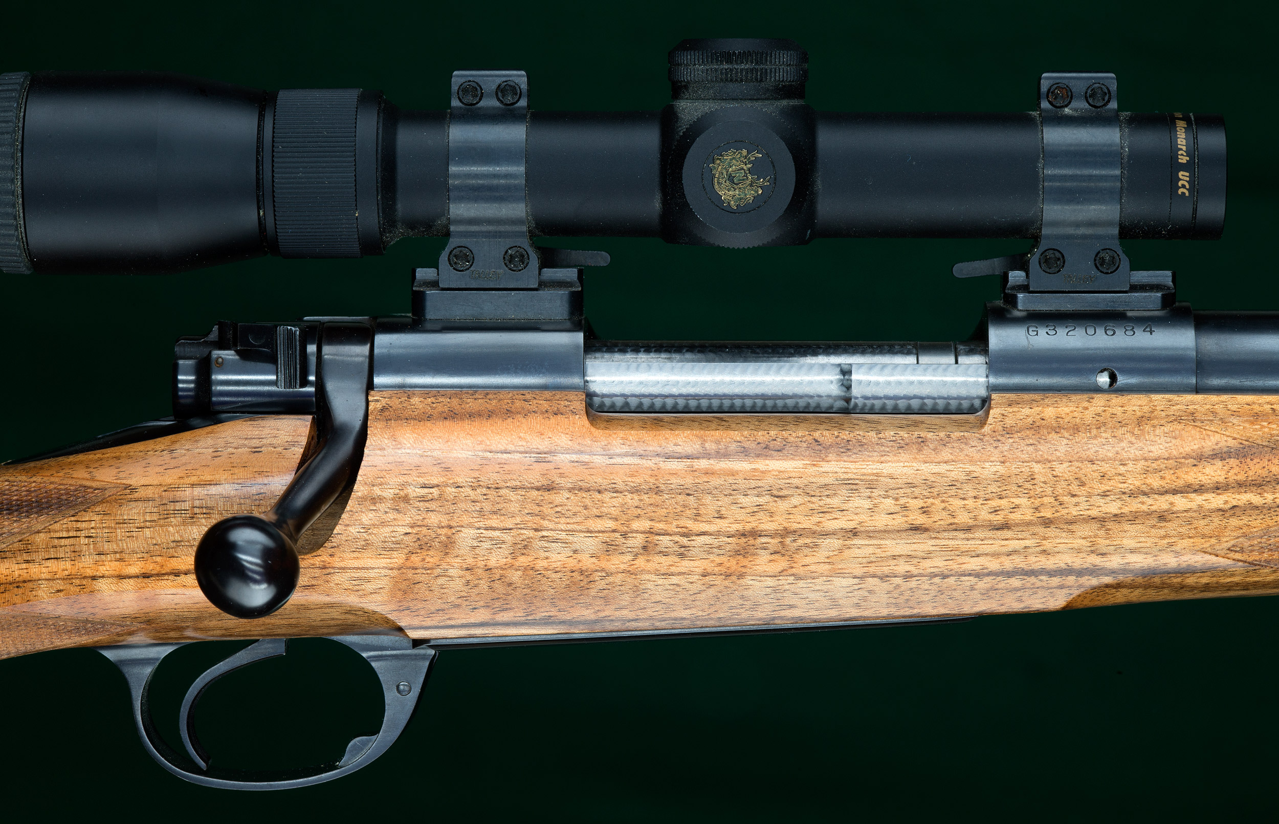 | controlled-feed Model 70 action with built-up and checkered bolt stop, |
