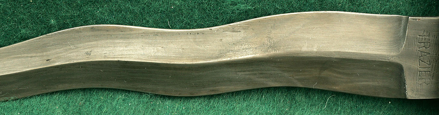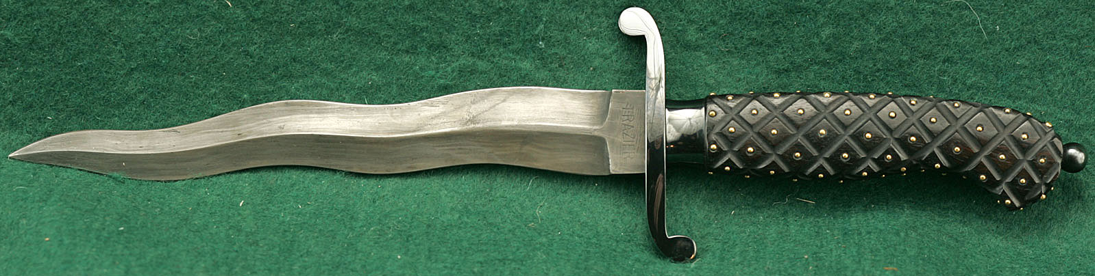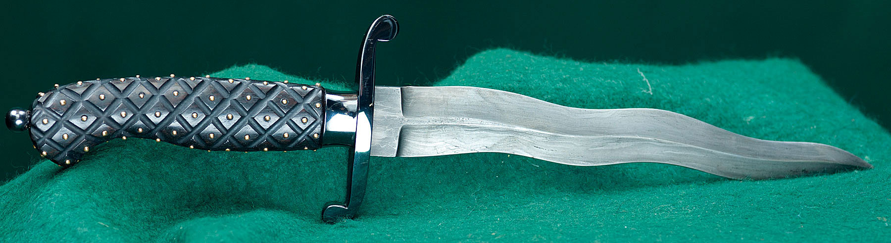 7 1/2" wavy kris-style double-edged blade of gray-blue damascus steel. One-piece, crosshatched |