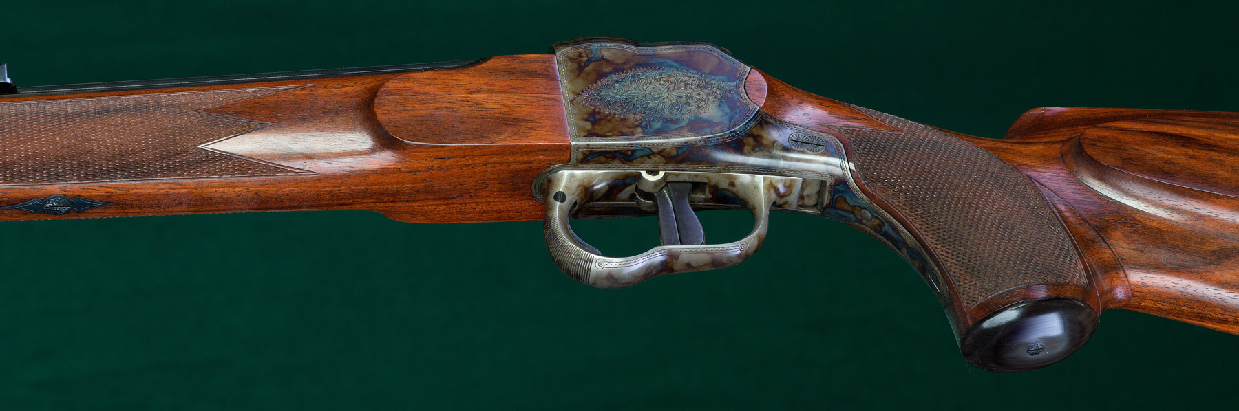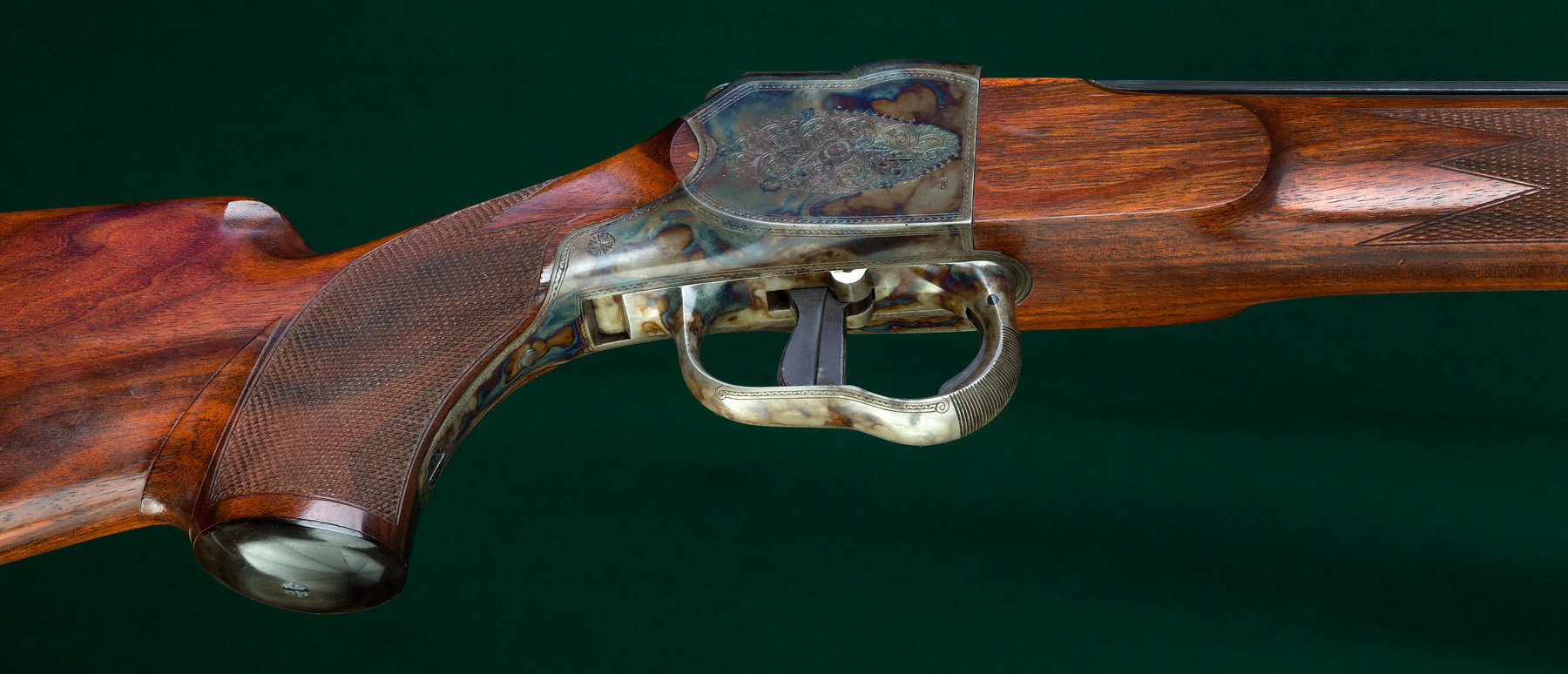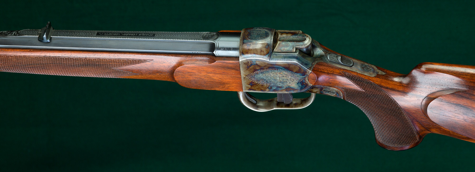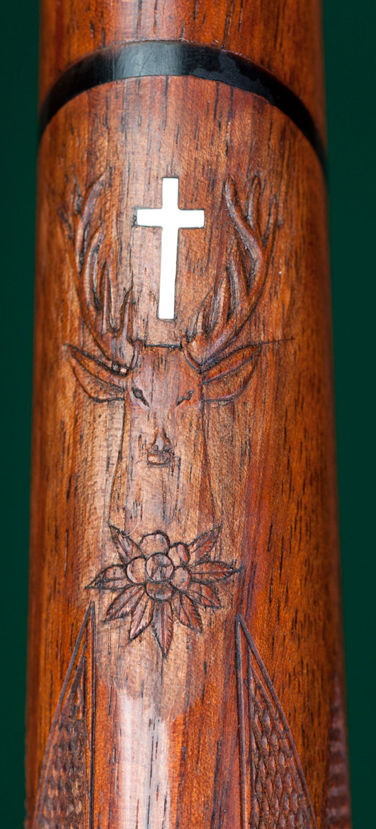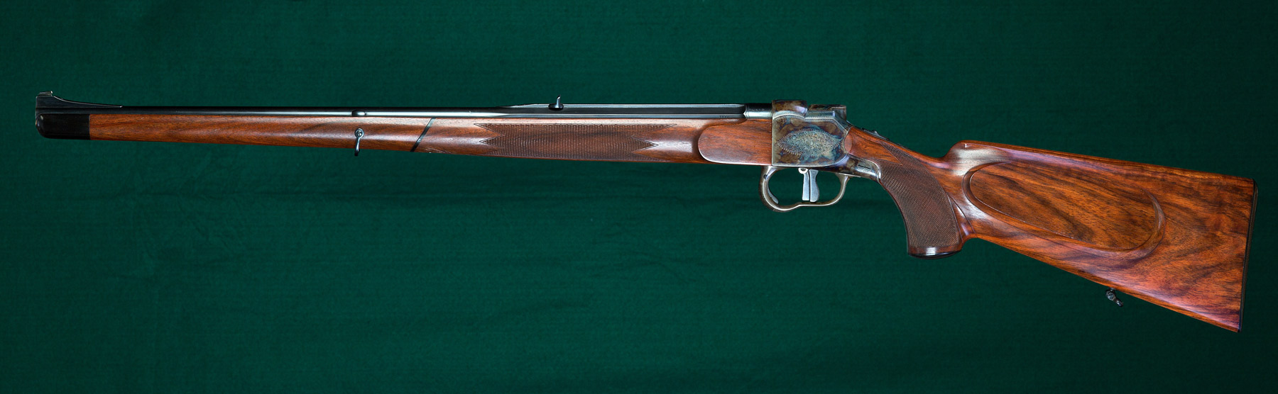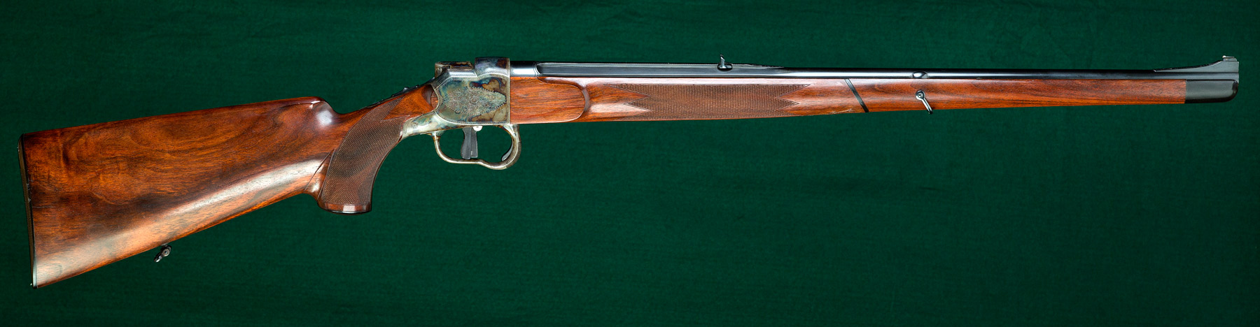 24 1/2" tapered octagon-to-round barrel with half-band-mounted swivel bale, ivory bead front sight on integral ramp, matted integral quarter rib and single standing express sight. 15 1/8"pull to striated horn buttplate. Full Mannlicher-style stock to the muzzle of figured European walnut with Shelhamer-type chinstrap, beaded pancake cheekpiece, horn forend tip, horn pistol grip cap and rear swivel. Case hardened Heeren action built by Omega Watch Co. with cocking/de-cocking trigger, manual top tang safety and light border and rose & scroll engraving. St. Hubertus' vision discretely carved in underside of forend with cross inlaid in ivory. Weight: 7lbs, 9oz. Nearly new condition.