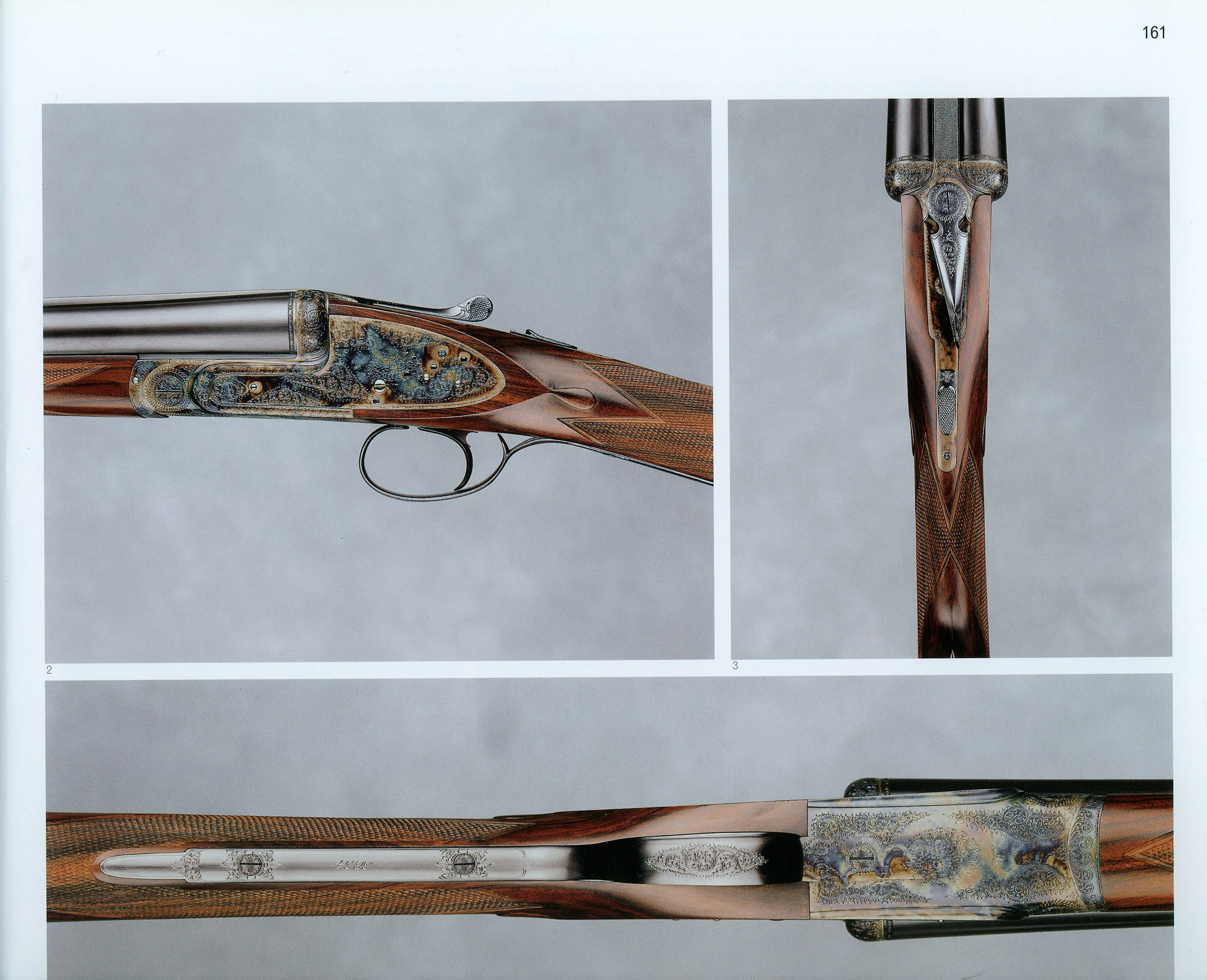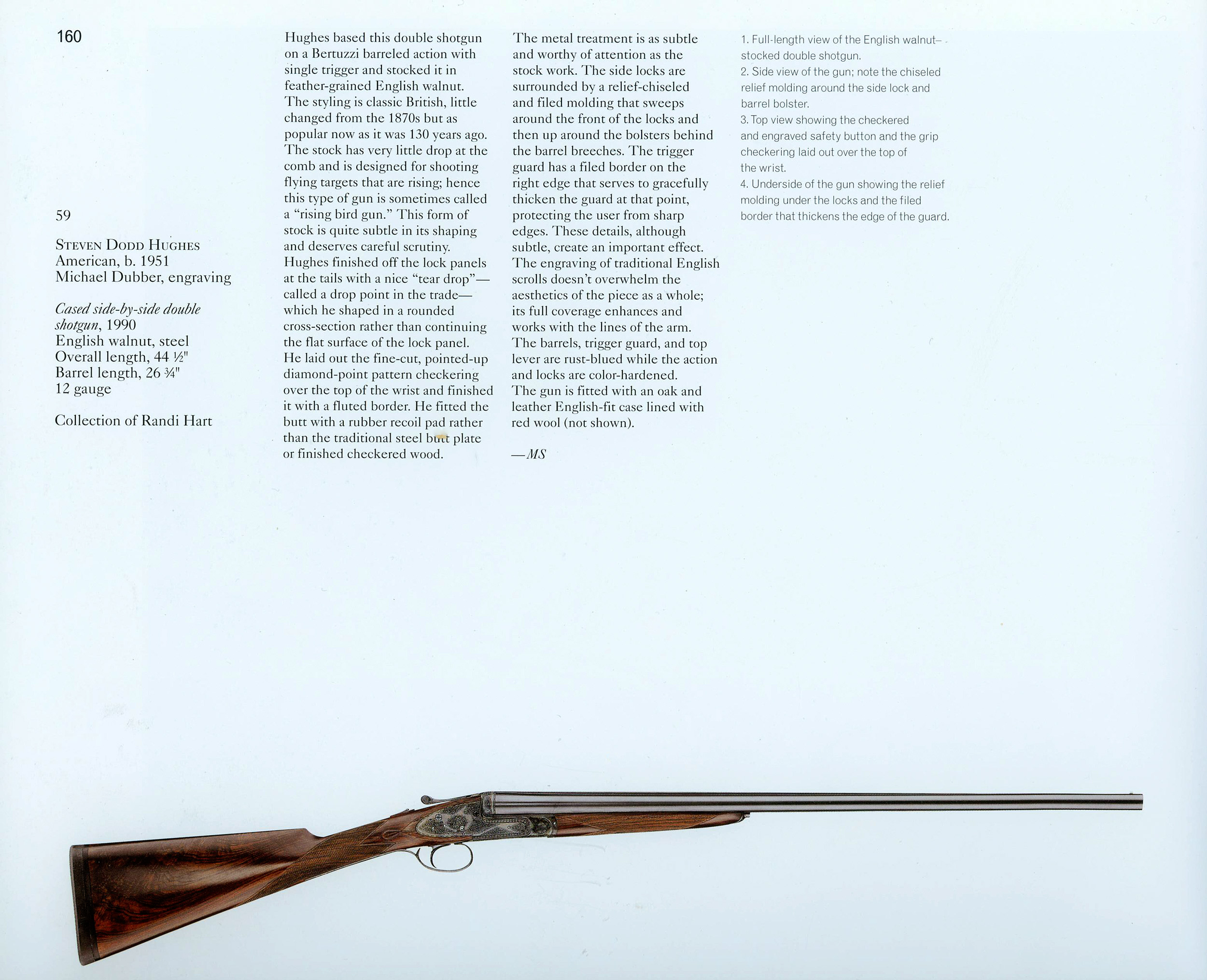 27" SxS chopper-lump barrels with flat matted rib and ivory bead front sight choked improved cylinder & modified. 15" pull from mechanical single trigger. 1 1/2" - 2 1/4" drop. 3/8" cast-off. Highly figured California English walnut stocks with Anson-pushbutton-release splinter forend with engraved escutcheon, teardrops, straight English grip, classic point-pattern checkering with mullered borders---wrapping completely around the entire wrist---and solid black Old English recoil pad. Sculpted, Turnbull-casehardened, bar-action sidelock with gold-line cocking indicators, automatic ejectors, bushed firing pins with retaining setscrews, manual top tang safety with SAFE inlaid in gold, and beaded-edge long-tang triggerguard. Classic English rose & scroll engraving by Michael Dubber. Weight: 6lbs, 10oz. Bertuzzi barreled action built 1980. Shotgun completed by ACGG member Steven Dodd Hughes in 1999. In nearly new condition, retaining all of its original finishes, excellent bores, tight, and with strong ejectors in perfect time. Signed with a gold-inlaid SDH touchmark behind the trigger and by Michael Dubber in front. In leather trunk case with cleaning accessories. On the cover of and subject of an article in the ACGG journal, GUNMAKER (copy included). Exhibited at "Three Centuries of Tradition: The Renaissance of Fine Sporting Arms in America" at the Minneapolis Institute of Arts and the Houston Museum of Fine Art 2003/4, and subject of a two-page spread in the book covering the exhibition (copy below). $24,750.