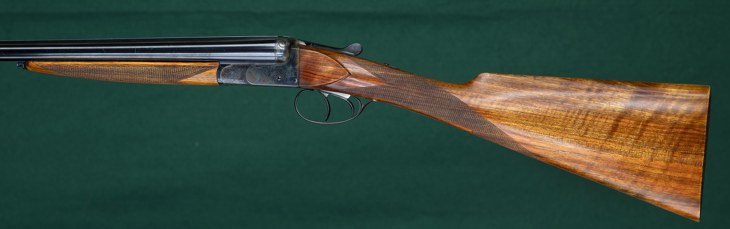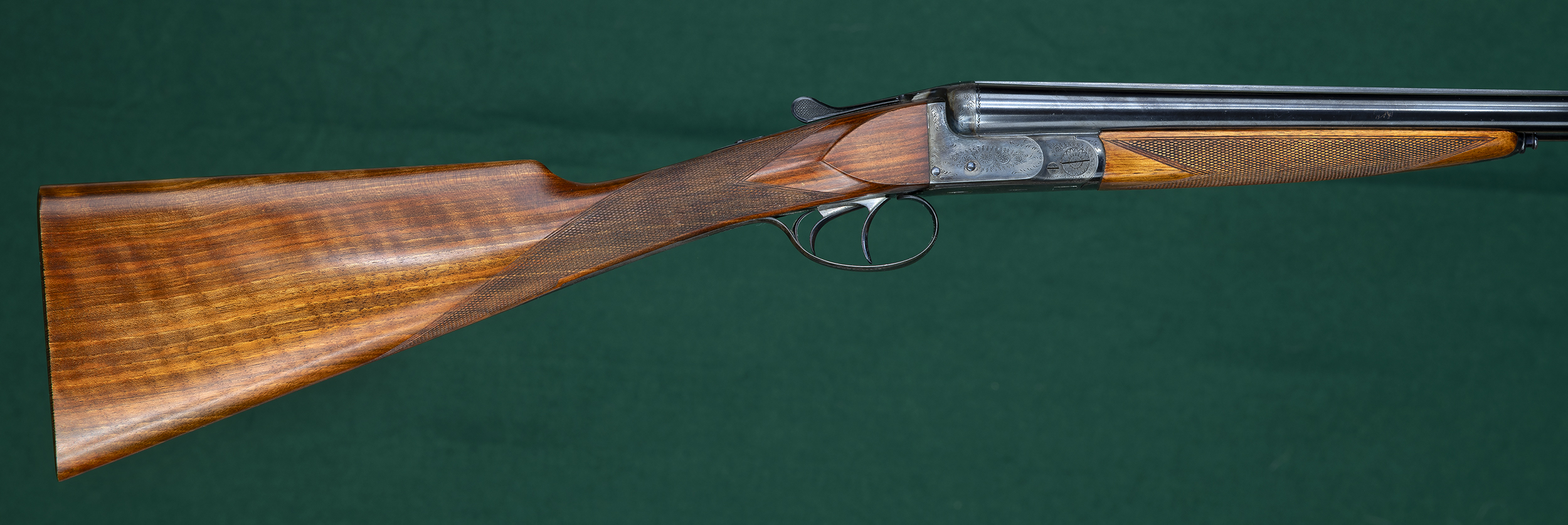 | | splinter forend, classic point-pattern checkering, straight English grip, and |