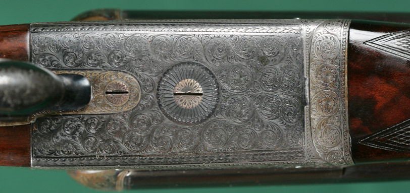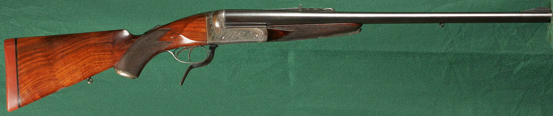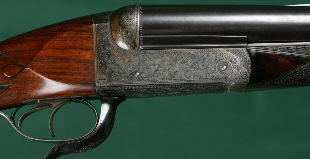 Description: 25" SxS chopper-lump barrels with quarter rib, 1 standing and 3 folding express sights. 14 3/16"pull from front trigger to solid red Pachmayr Old English pad. Figured, straight and strong, English walnut stock with steel capped pistol grip, lever-release splinter forend, teardrops and vacant silver oval. Fully scroll-engraved receiver with doll's head and bushed firing pins with retaining setscrews. Built in 1907. 98% original barrel blue. 95% original lever and triggerguard blue. 90% original case colors. Mirror bright bores. SAFE in gold. In oak and leather case.