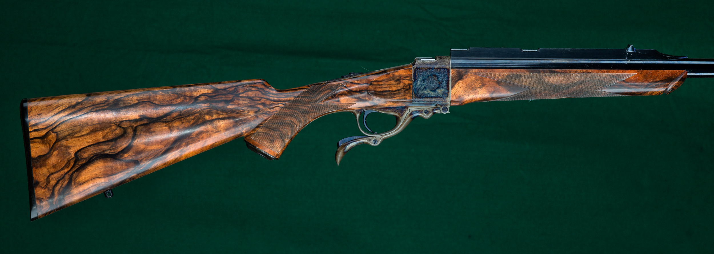 | | Highly figured, black-streaked Turkish walnut stock with Alex Henry forend, |