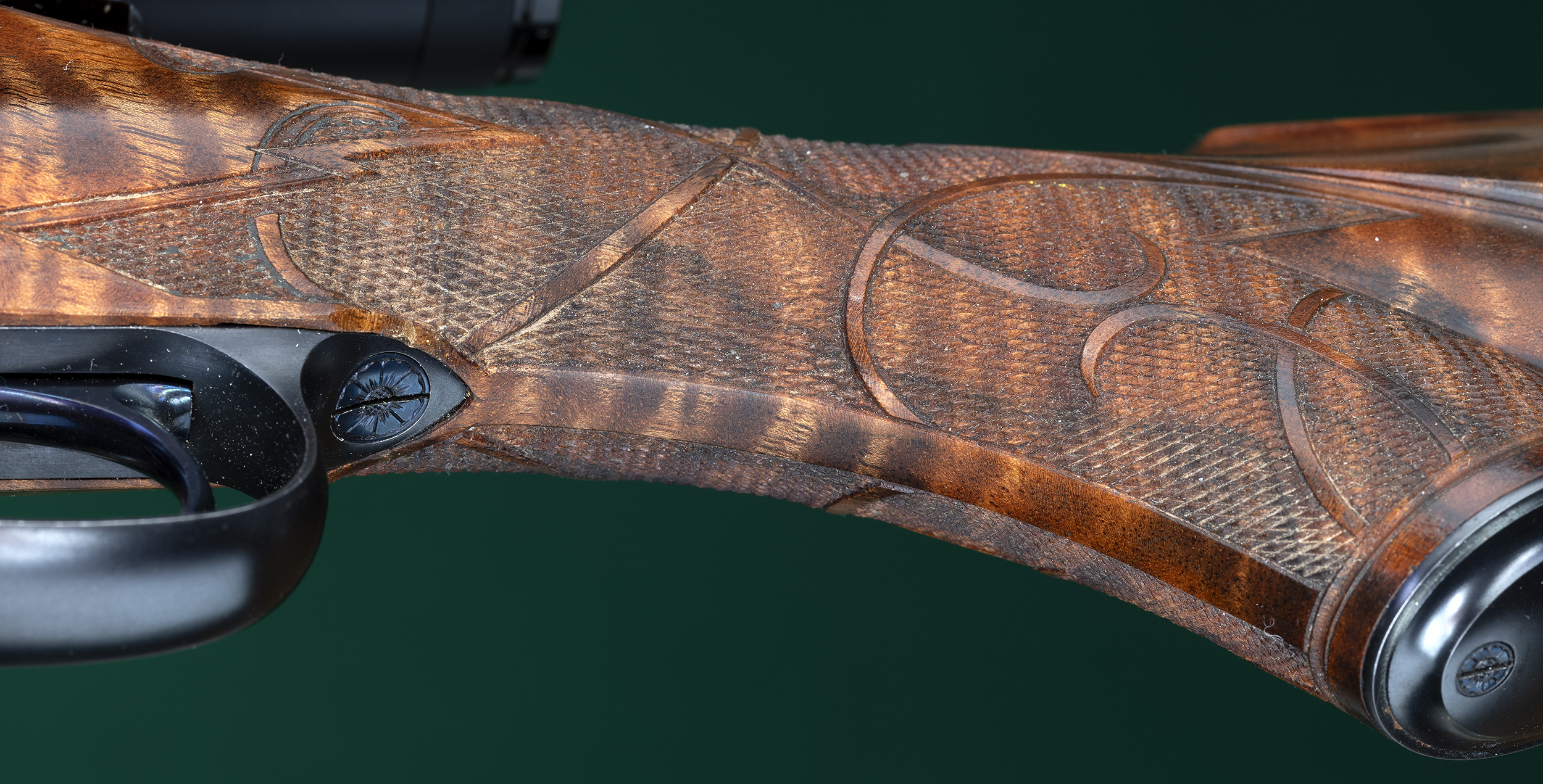 | | oval, classic comb, beaded cheekpiece, and hand-checkered steel trapdoor |