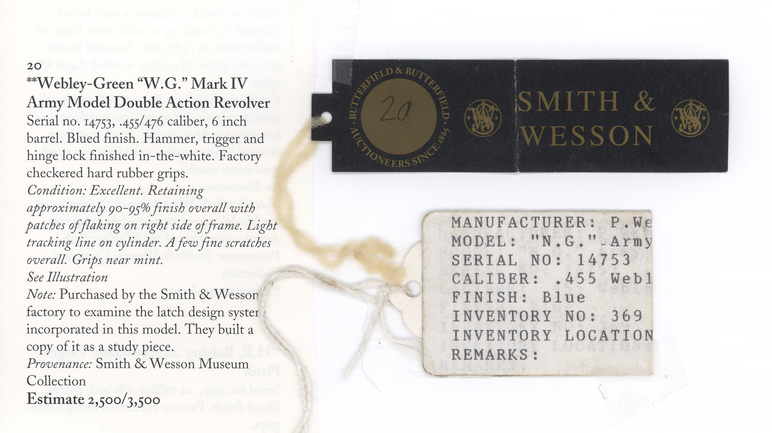 Weapon tags from Smith & Wesson and from Butterfield & Butterfield. And, clipping from auction July 1996, San Francisco. Owned by Hallowell & Co, since then.
