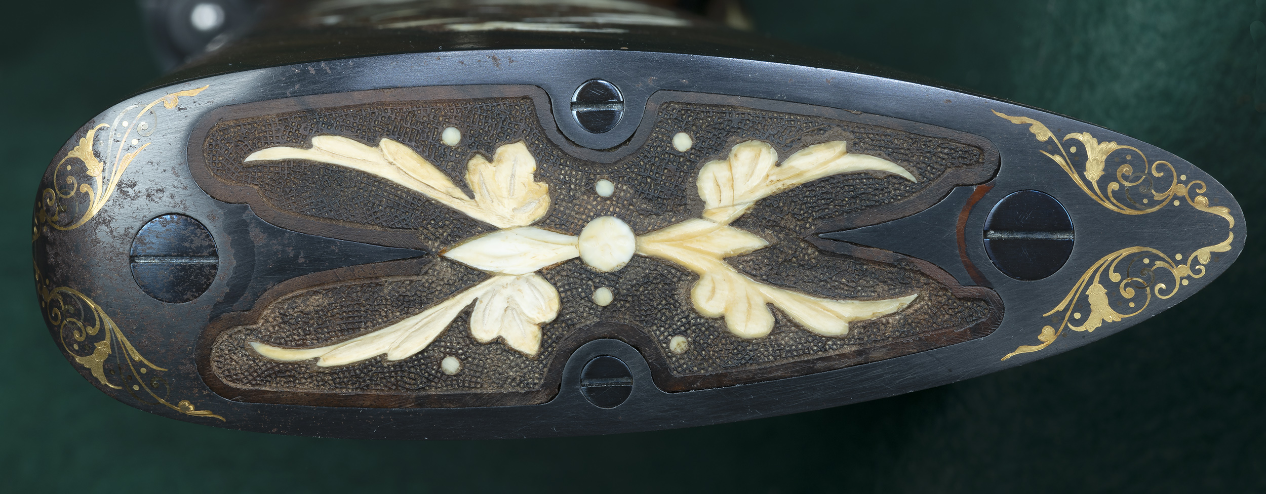 | | peaked skeleton buttplate. Stock carved and ivory floral scroll inlaid astride |