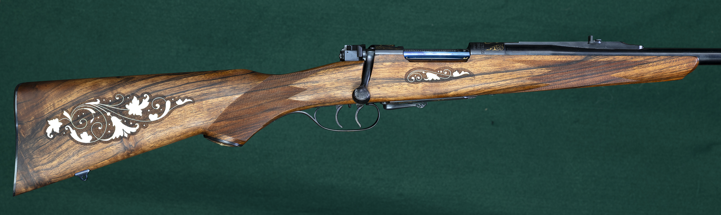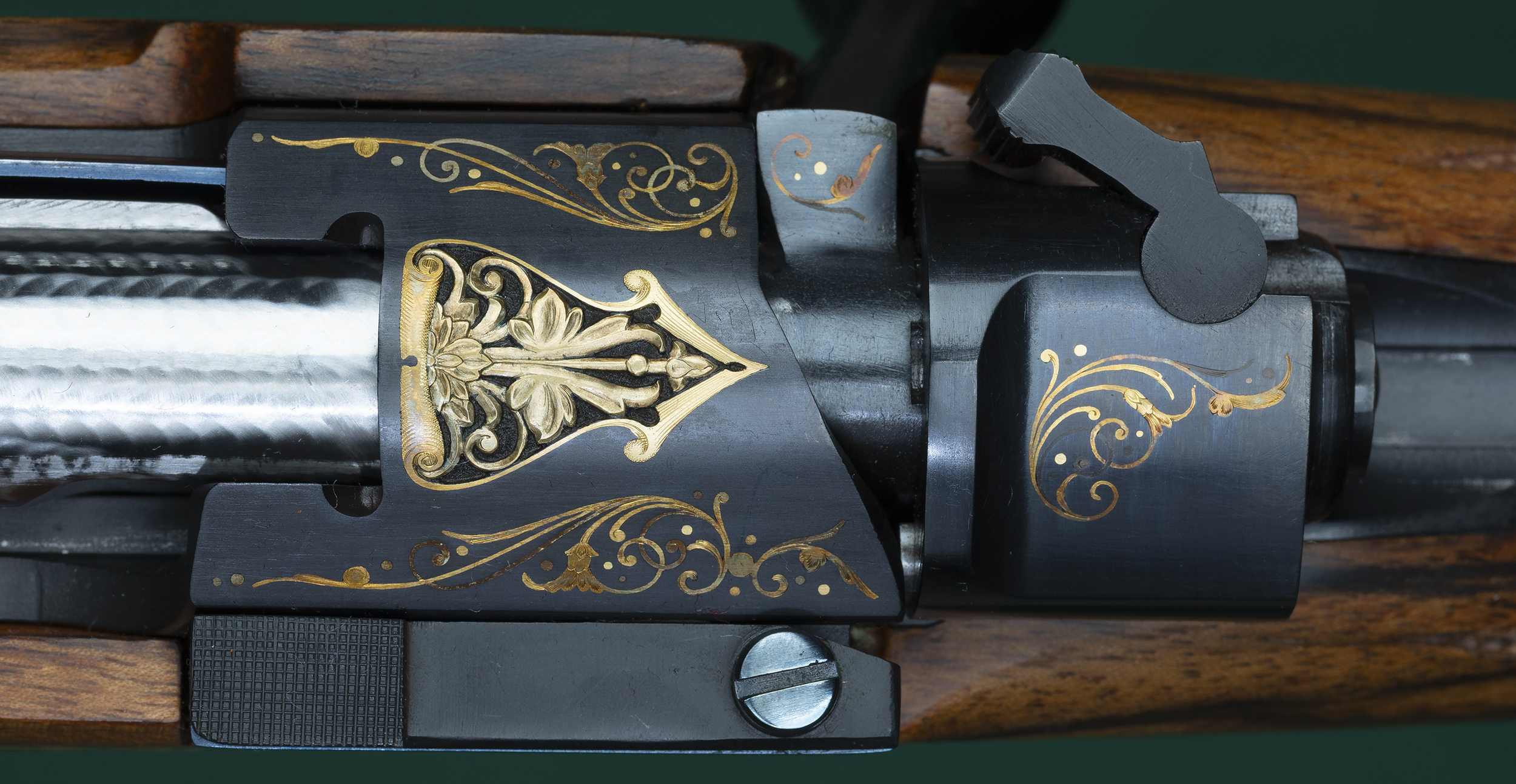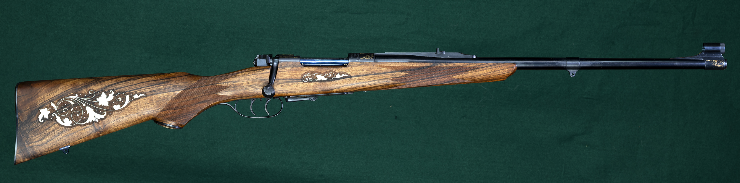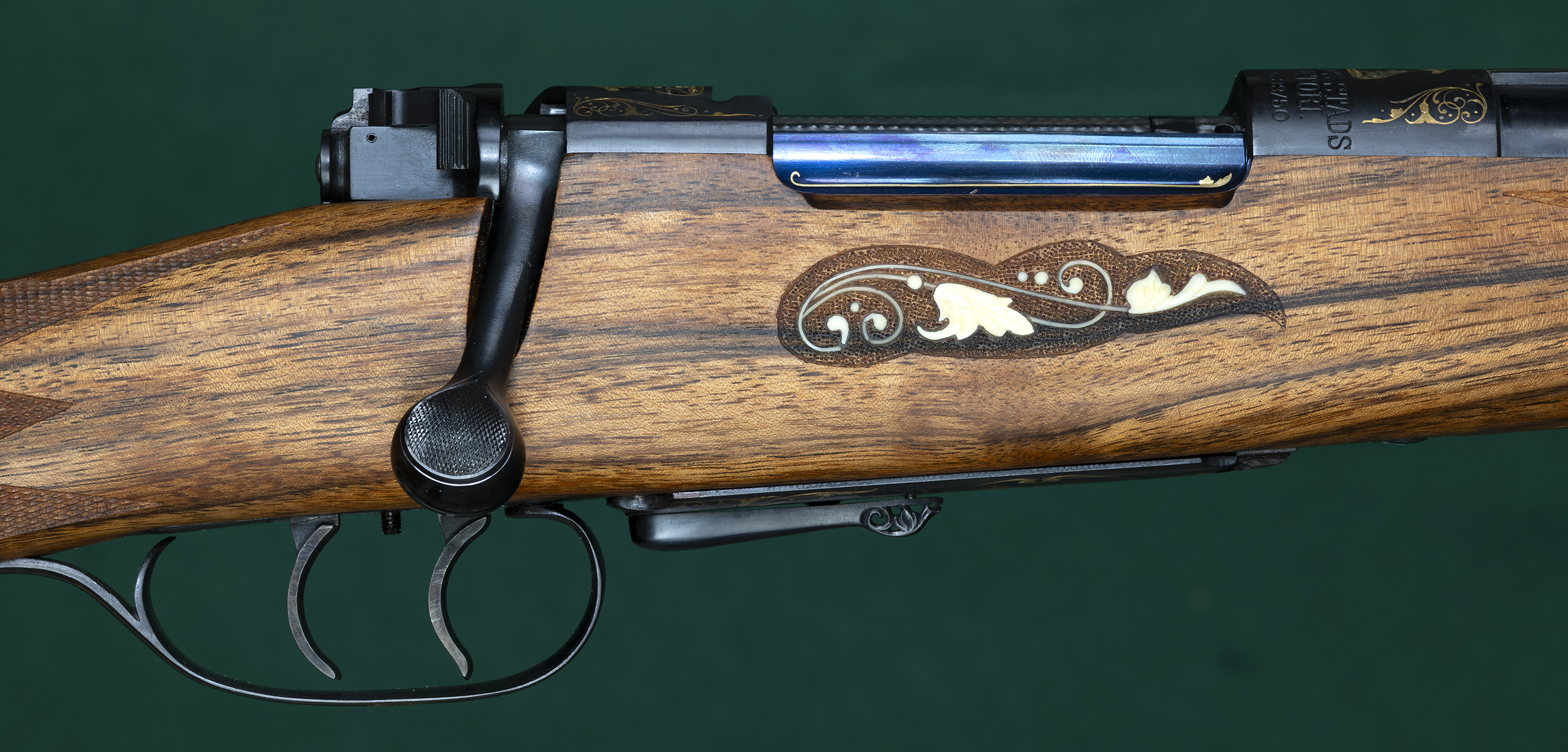 | | Swedish Mauser action with widow's-peaked rear tang, jeweled bolt and |