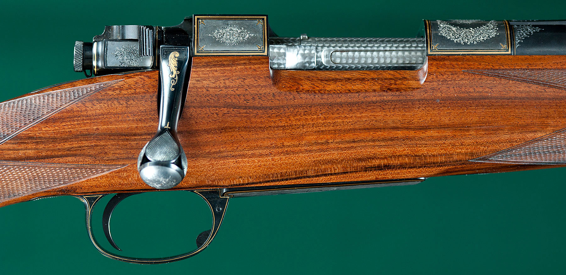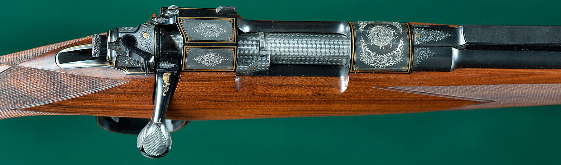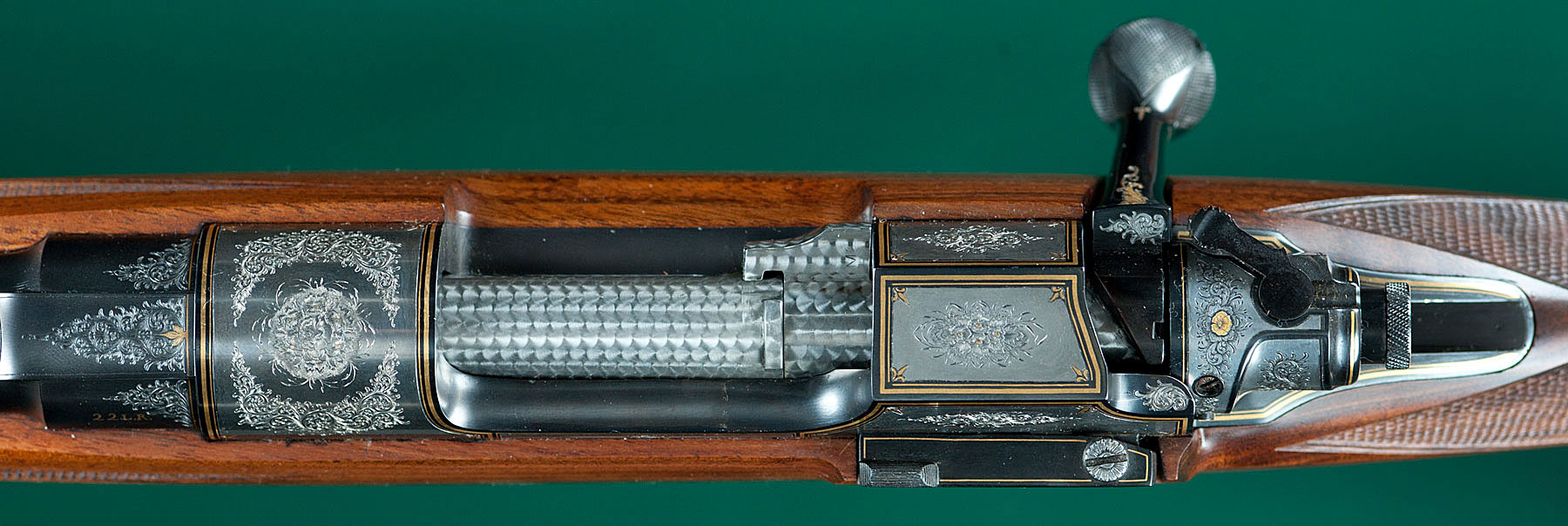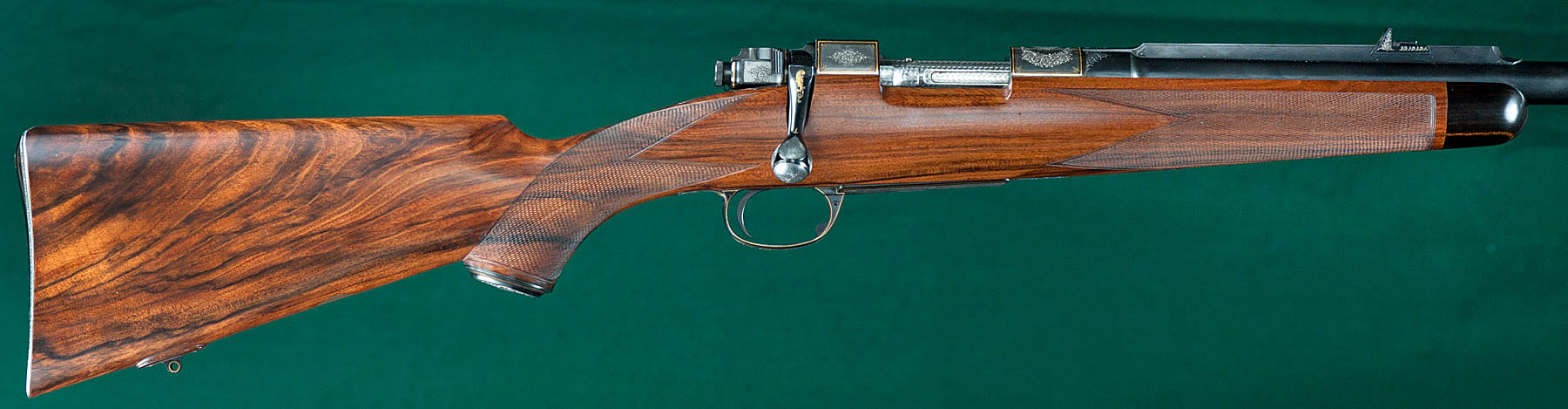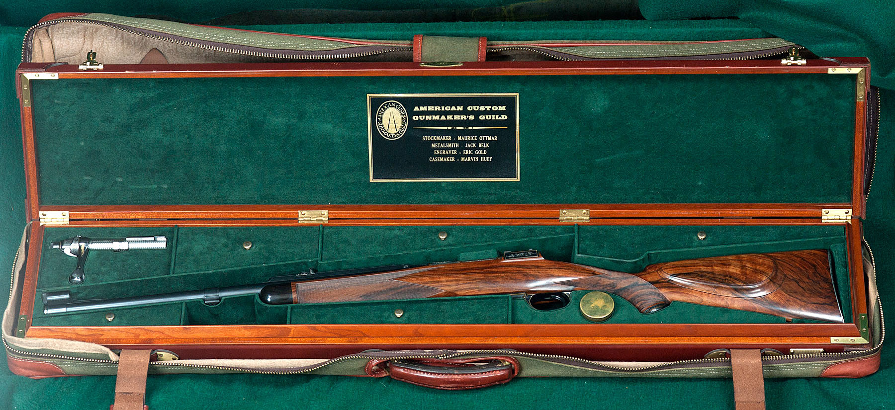 20" barrel with integrally-machined ramp front sight (with hood), integrally-machined full-band swivel base and integrally-machined quarter rib with 1 standing bone-inlaid and 1 folding gold-lined express sight, engraved 50 and 100 yards. Stocked with fully figured walnut by Maurice Ottmar: ebony forend tip with widow's peak, double-beaded pancake cheekpiece, classic wrap-around point-pattern checkering with mullered borders and complimentary widow's peak at forend, engraved steel pistol grip cap, vacant gold oval, inletted and pedestalled rear swivel base and trapdoor buttplate containing spare magazine. Metalwork by Jack Belk: action made from two US Springfield 1922 M2 .22 training rifle actions, cut and rejoined to a shortened double-squarebridge with Mauser-style bolt stop, Model 70-type safety, jeweled bolt, pierced bolt knob, detachable magazine concealed inside hinged straddle floorplate with release inside triggerguard. Engraved by Eric Gold: fox chasing rabbit on floorplate and fine rose & scroll with gray-etched and gold-line accents covering receiver. Rust blue by Maurice Ottmar; Grey finish by Eric Gold. Weight: 8lbs. Pull: 13 1/2". Oak & leather case by Marvin Huey with accessories and canvas overcase. The American Custom Gunmakers Guild, founded in 1983, is dedicated to the advancement of the art of custom gun building. Each year the organization creates a special custom gun which is raffled at their annual convention each January in Reno. This was the 9th project, completed in 1994. Pictured in Turpin's Modern Custom Guns, p73. Subject of a chapter in Steven Dodd Hughes' Custom Guns in Black and White. From the Robert Peterson Collection. Virtually new. $24,950.