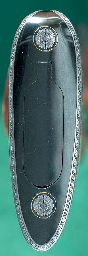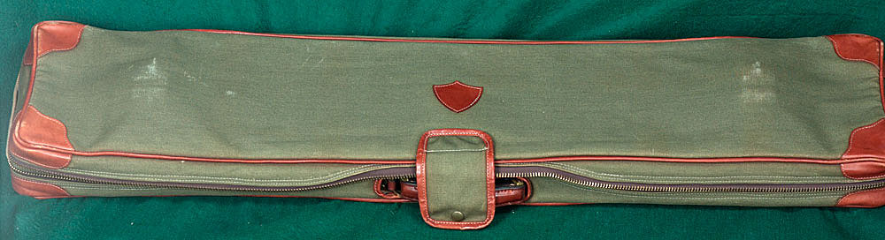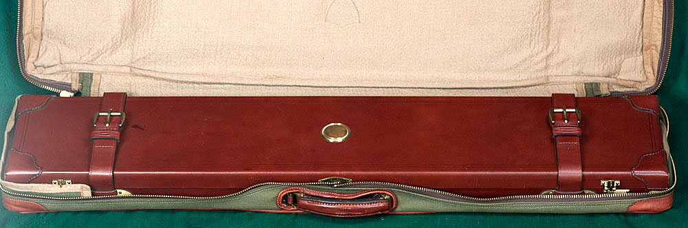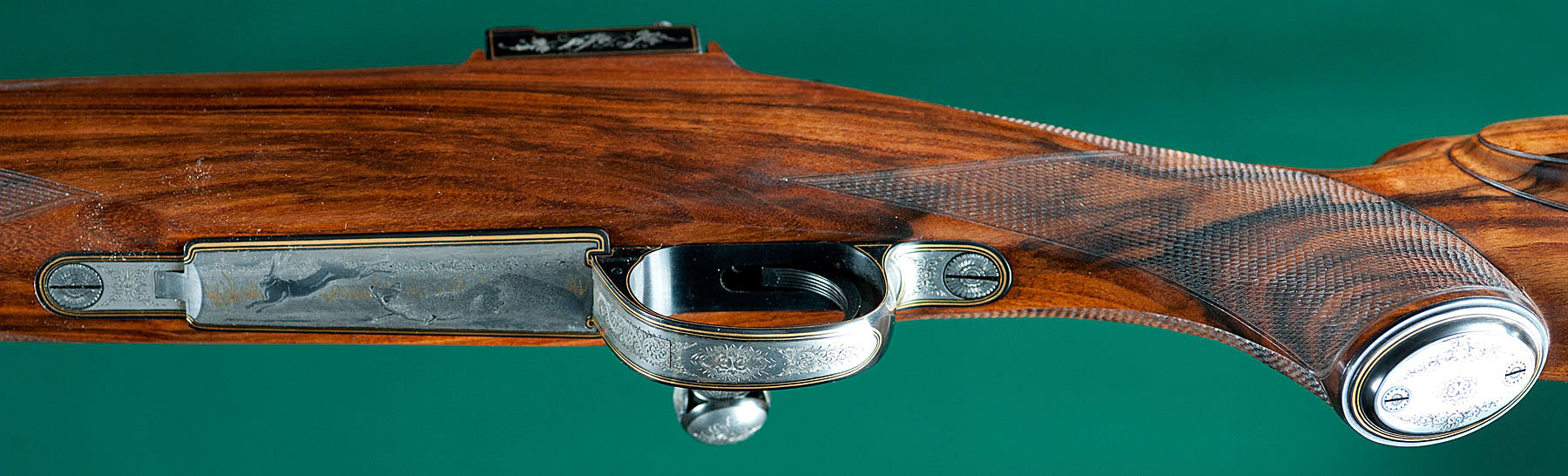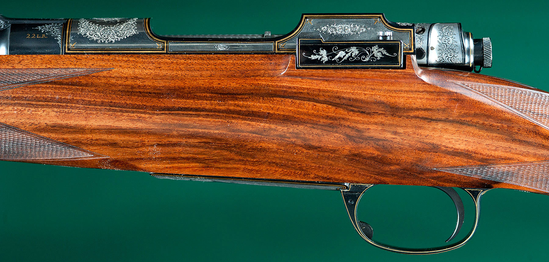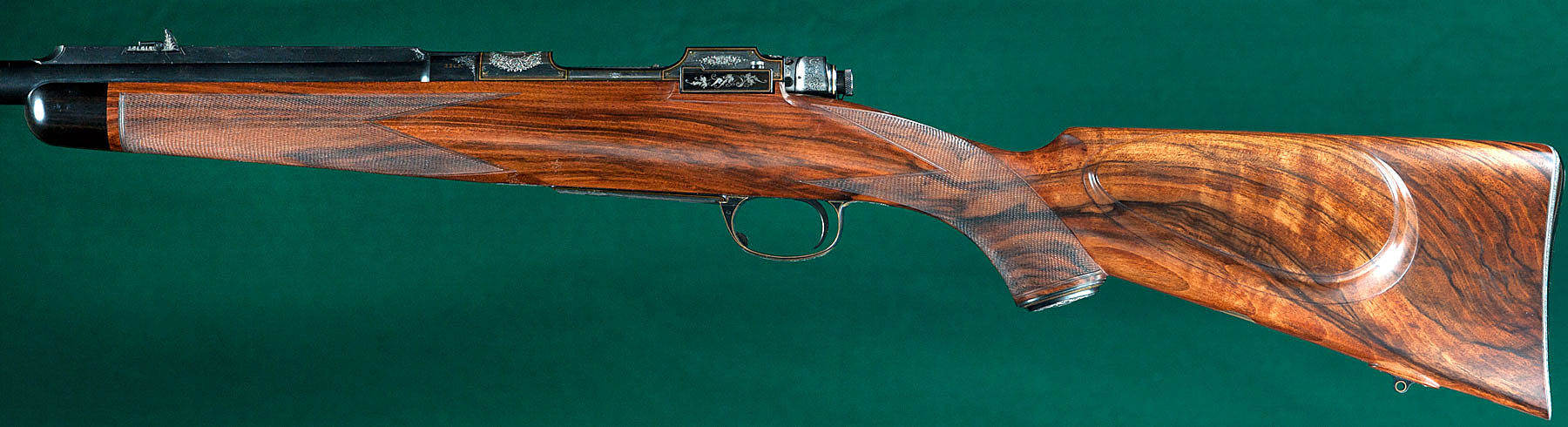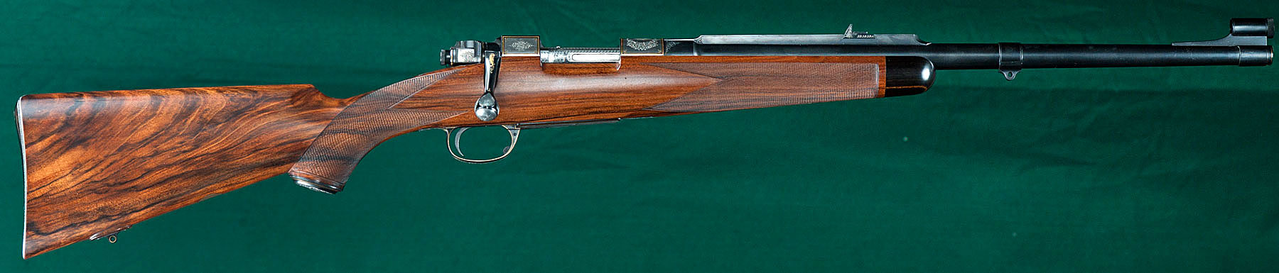 20" barrel with integrally-machined ramp front sight (with hood), integrally-machined full-band swivel base and integrally-machined quarter rib with 1 standing bone-inlaid and 1 folding gold-lined express sight, engraved 50 and 100 yards. Stocked with fully figured walnut by Maurice Ottmar: ebony forend tip with widow's peak, double-beaded pancake cheekpiece, classic wrap-around point-pattern checkering with mullered borders and complimentary widow's peak at forend, engraved steel pistol grip cap, vacant gold oval, inletted and pedestalled rear swivel base and trapdoor buttplate containing spare magazine. Metalwork by Jack Belk: action made from two US Springfield 1922 M2 .22 training rifle actions, cut and rejoined to a shortened double-squarebridge with Mauser-style bolt stop, Model 70-type safety, jeweled bolt, pierced bolt knob, detachable magazine concealed inside hinged straddle floorplate with release inside triggerguard. Engraved by Eric Gold: fox chasing rabbit on floorplate and fine rose & scroll with gray-etched and gold-line accents covering receiver. Rust blue by Maurice Ottmar; Grey finish by Eric Gold. Weight: 8lbs. Pull: 13 1/2". Oak & leather case by Marvin Huey with accessories and canvas overcase. The American Custom Gunmakers Guild, founded in 1983, is dedicated to the advancement of the art of custom gun building. Each year the organization creates a special custom gun which is raffled at their annual convention each January in Reno. This was the 9th project, completed in 1994. Pictured in Turpin's Modern Custom Guns, p73. Subject of a chapter in Steven Dodd Hughes' Custom Guns in Black and White. From the Robert Peterson Collection. Virtually new. $24,950.