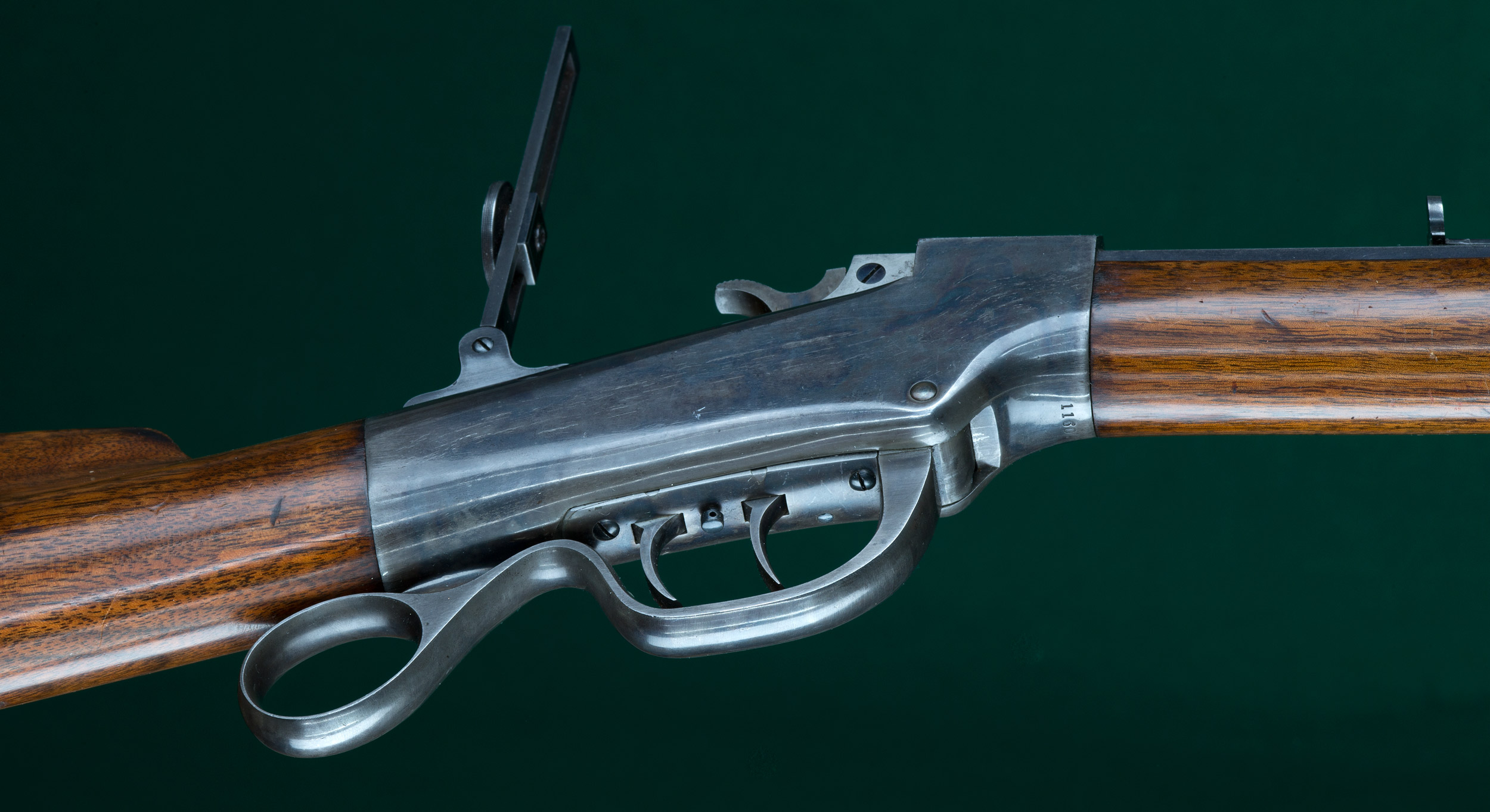 | triggers, finger-loop lever, checkered hammer and vernier tang peep sight. |