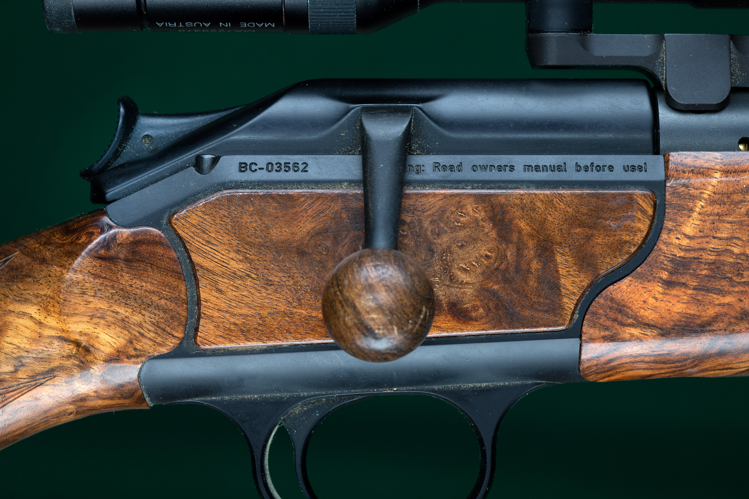 | | cocking/de-cocking action with walnut bolt knob. Interchangeable barrel |