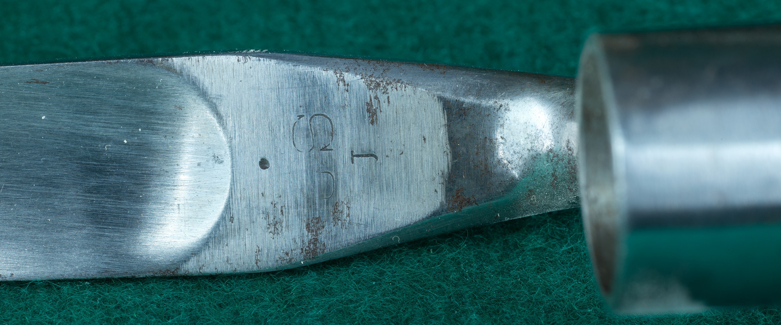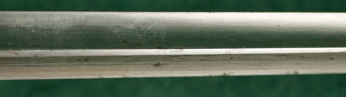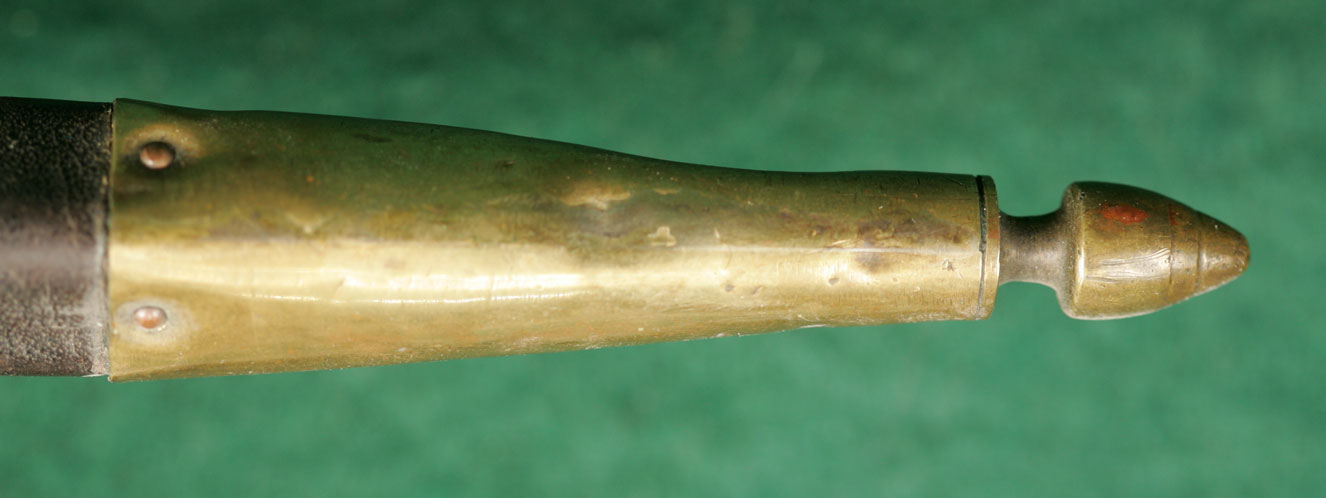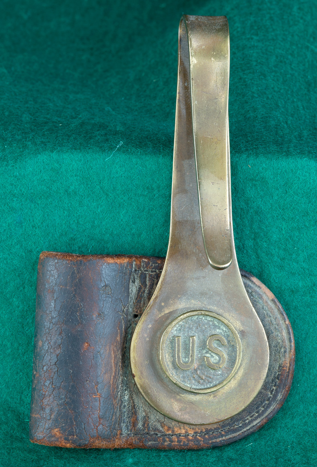 | 18" blade. 16 3/4"flute. Stamped US between shank and flute. With brass-tipped leather |