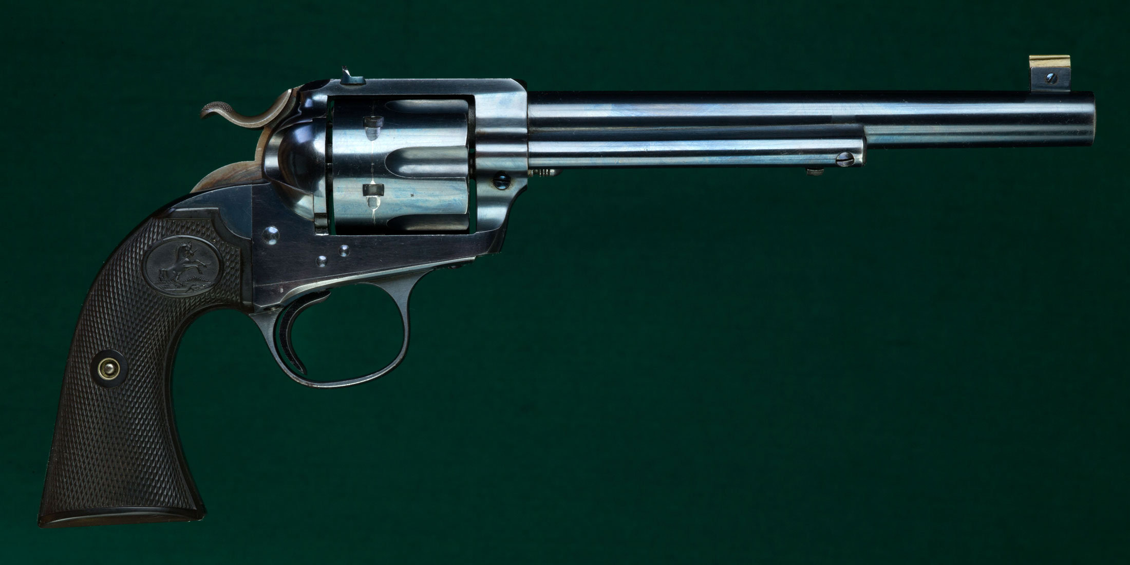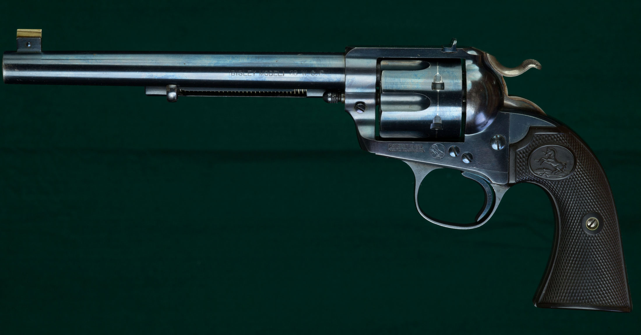 7 1/2" round barrel with German-silver blade front sight. Fine notch blade rear sight dovetailed through polished flat top of receiver. Original checkered black hardrubber grips. Smooth fire-blued trigger. Checkered, casehardened target hammer. Fire-blued screws. With factory letter confirming specification and showing shipment as a single revolver to Schwabacher Hardware Company in Seattle, December 22, 1910. Retaining 97% original blue finish with wear concentrated on the gripstraps. Excellent bore. Crisp, tight action. Rare: one of a total of only 976 Bisley Flat Top Target revolvers, and one of only 98 built in this calibre.