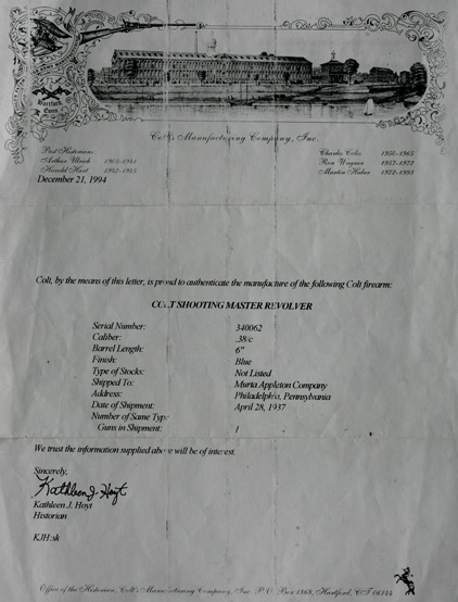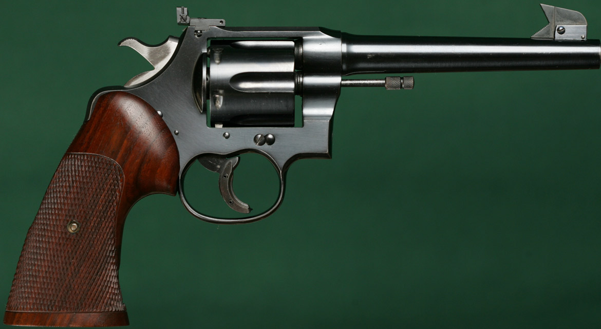 6" barrel with custom front sight insert. Micro adjustable rear sight. Matted flat top frame. Deluxe checkered walnut thumbrest target grips. Factory checkered front and rear gripstraps. Trigger shoe. Mfd 1937. 99%blue. Frame not altered for acceptance of custom sights. With copy of factory letter. $1195.