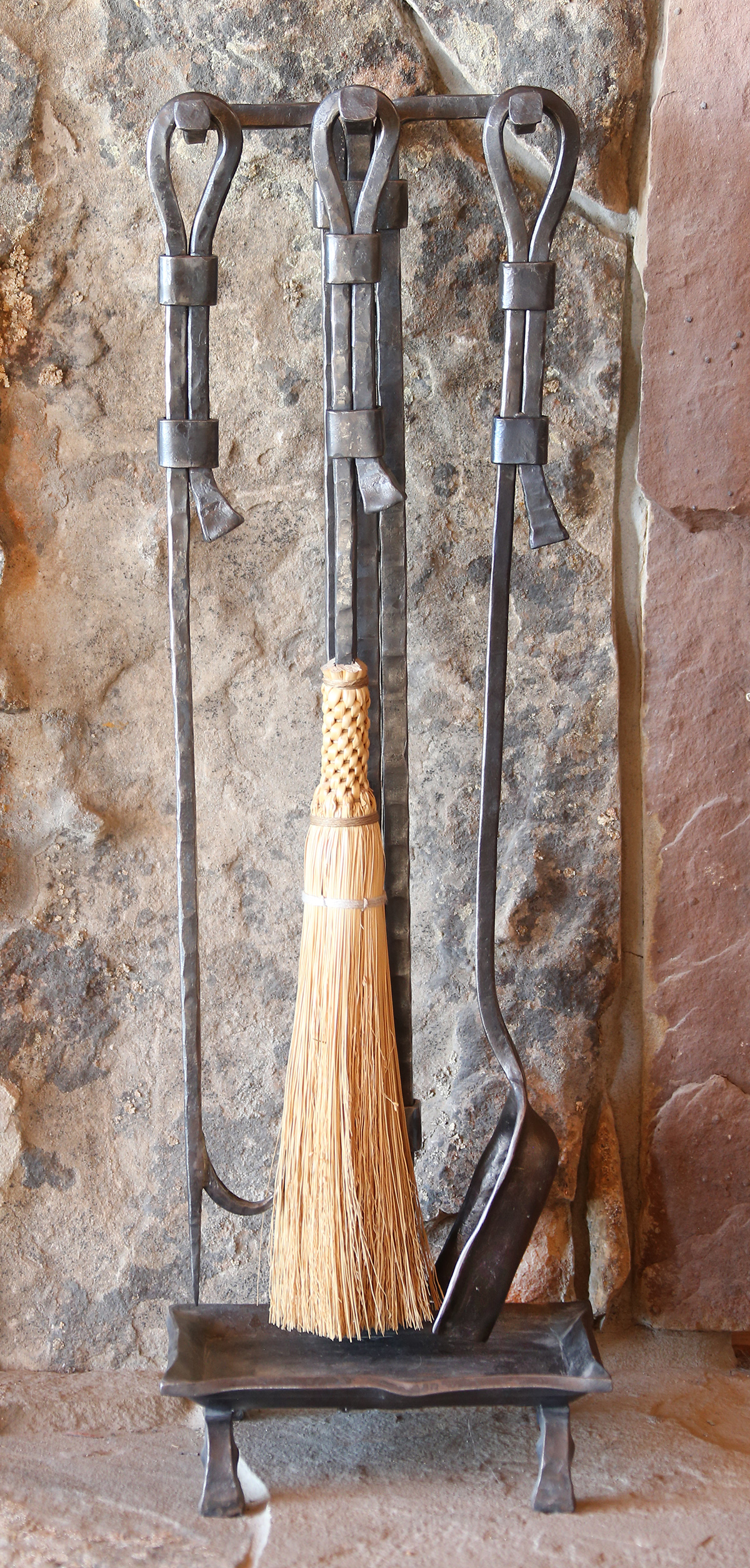 Above: Three-piece firetool set with stand. This one, 26" tall. The stand is made from three continuous gathered bars, flaring out at the base