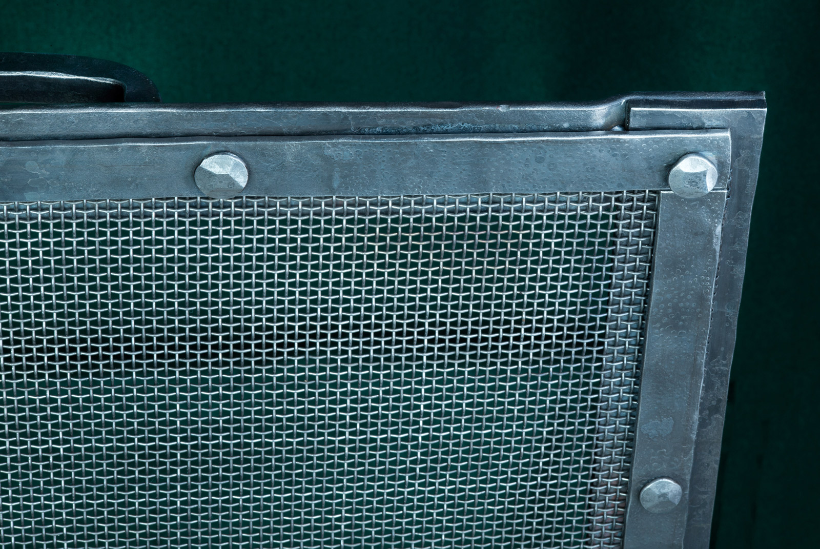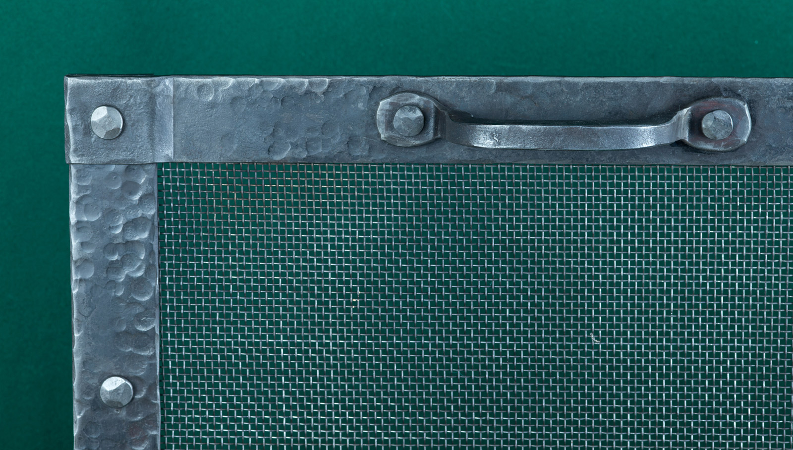 Rear view. Upper-left corner of hammered back frame, riveted to the front frame, sandwiching 6-to-the-inch steel wire mesh.
