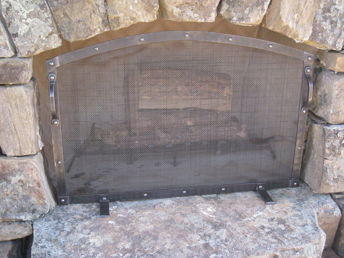 Freestanding Firescreen, arched top, tab feet and side handles for use on raised exterior hearth.