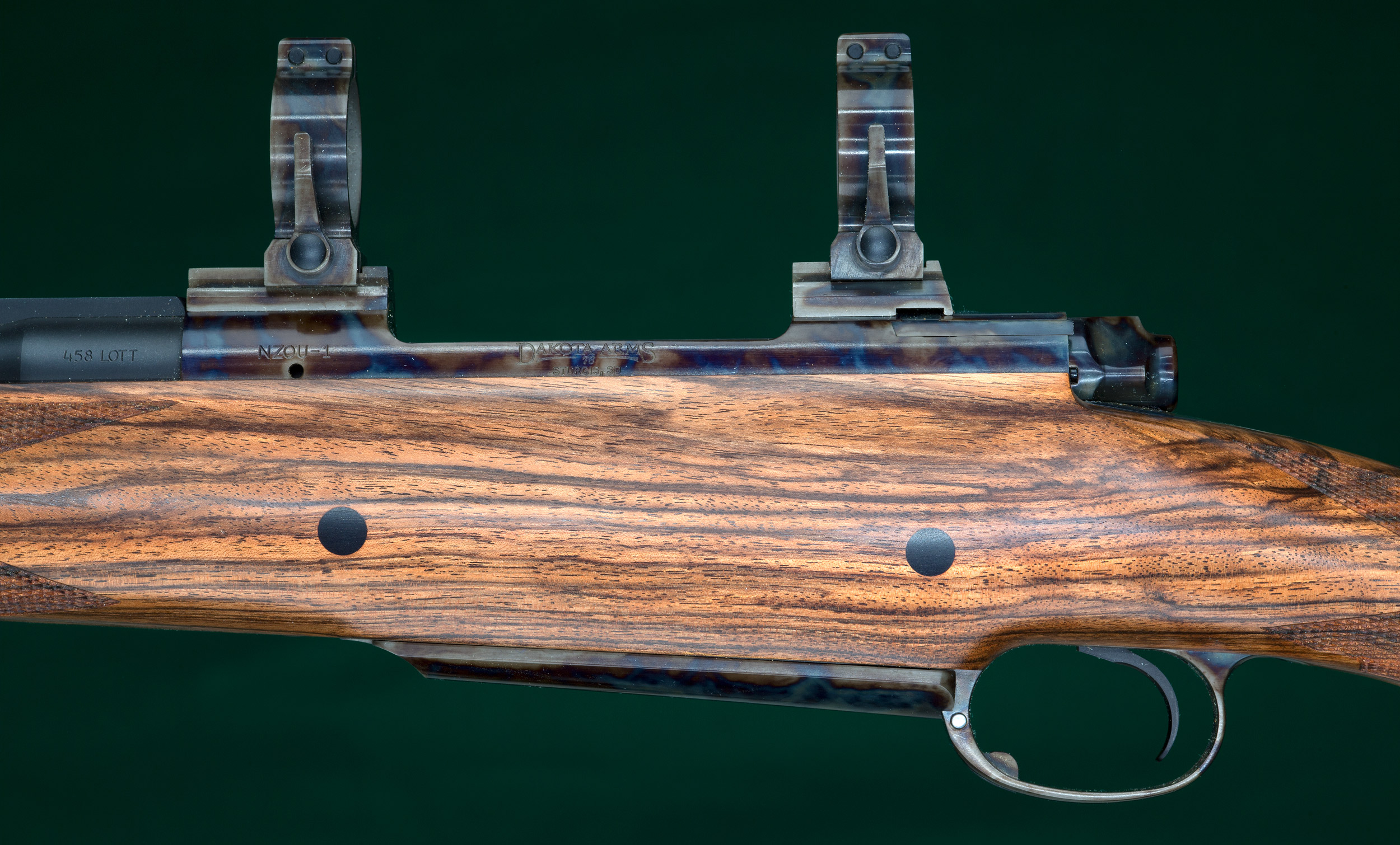 24" tapered round barrel with full-band detented-hooded front sight, full-band swivel base and quarter rib with one solid standing express sight. Fully figured black-streaked European walnut stock with ebony forend tip, classic borderless point-pattern checkering (wrapping under the forend), twin recoil crossbolts, steel capped pistol grip, beaded cheekpiece, inletted rear swivel stud, mercury recoil compensator inside buttstock, and black Decelerator recoil pad. Dakota 76 action with jeweled bolt, 3-panel checkered bolt knob, Model 70-type three-position safety and hinged straddle drop-box magazine with release inside triggerguard. Talley 30mm quick-detachable scope mounts. Color-casehardened action, bottom metal, scope mounts, cocking piece and pistol grip cap. Custom serial number: NZOU-1, for Elephant, in the African language, Shona. Pull: 14 1/4". Weight: 9lbs, 10oz. Little used, retaining 99%+blue and color-hardening. $4995.