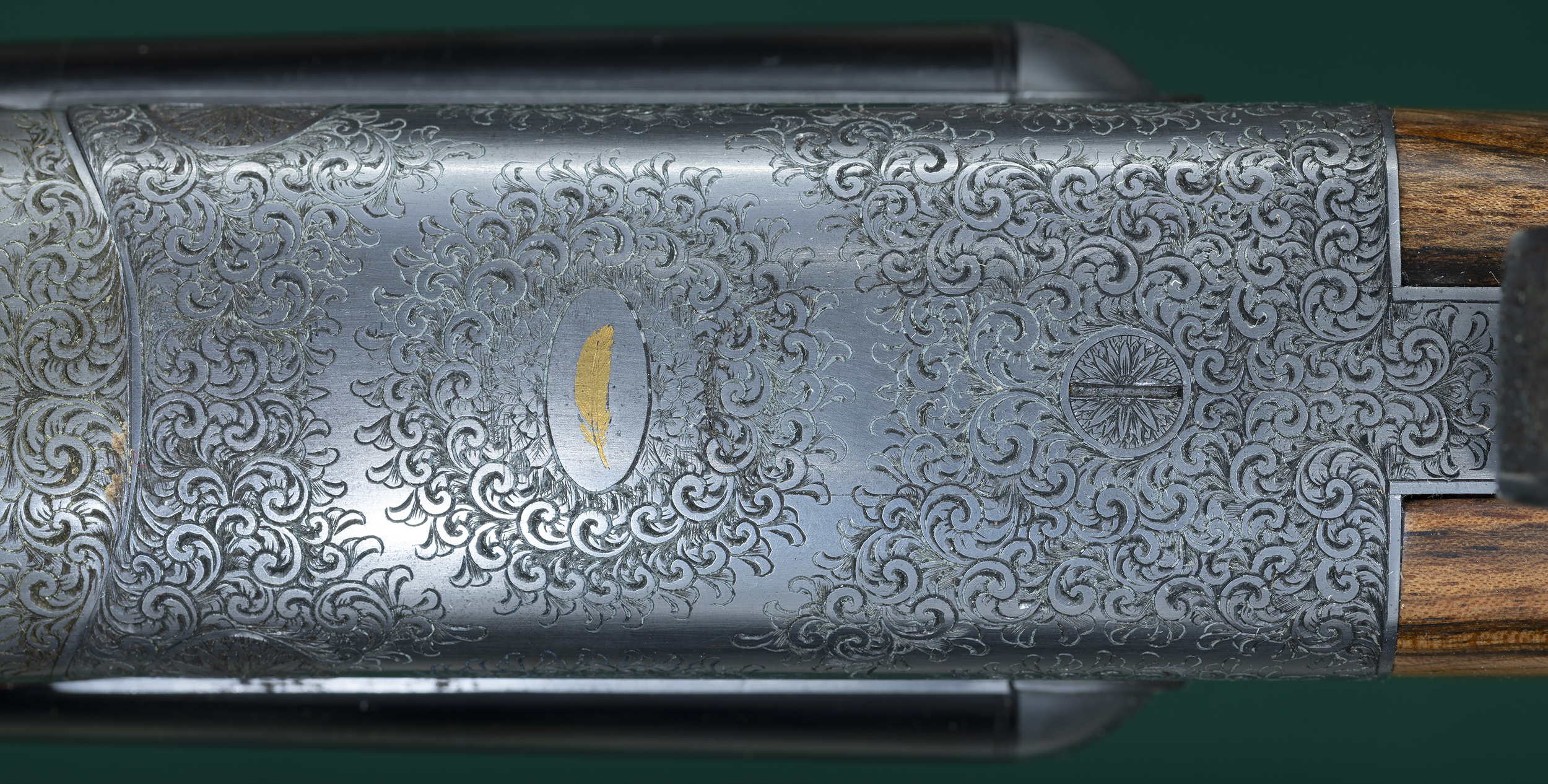 | | rounded, pinless, French gray, boxlock action with gold feather on the |