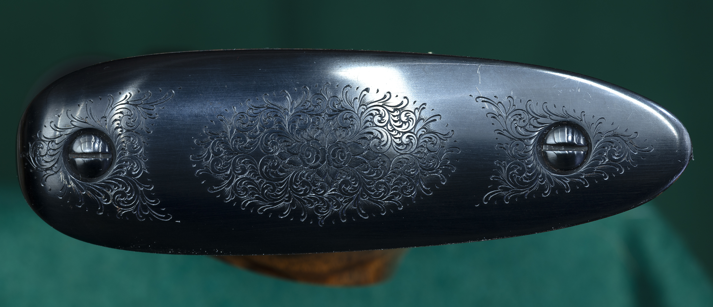 | engraving on all-blued steel by Jere Davidson with gold antelope on left and |