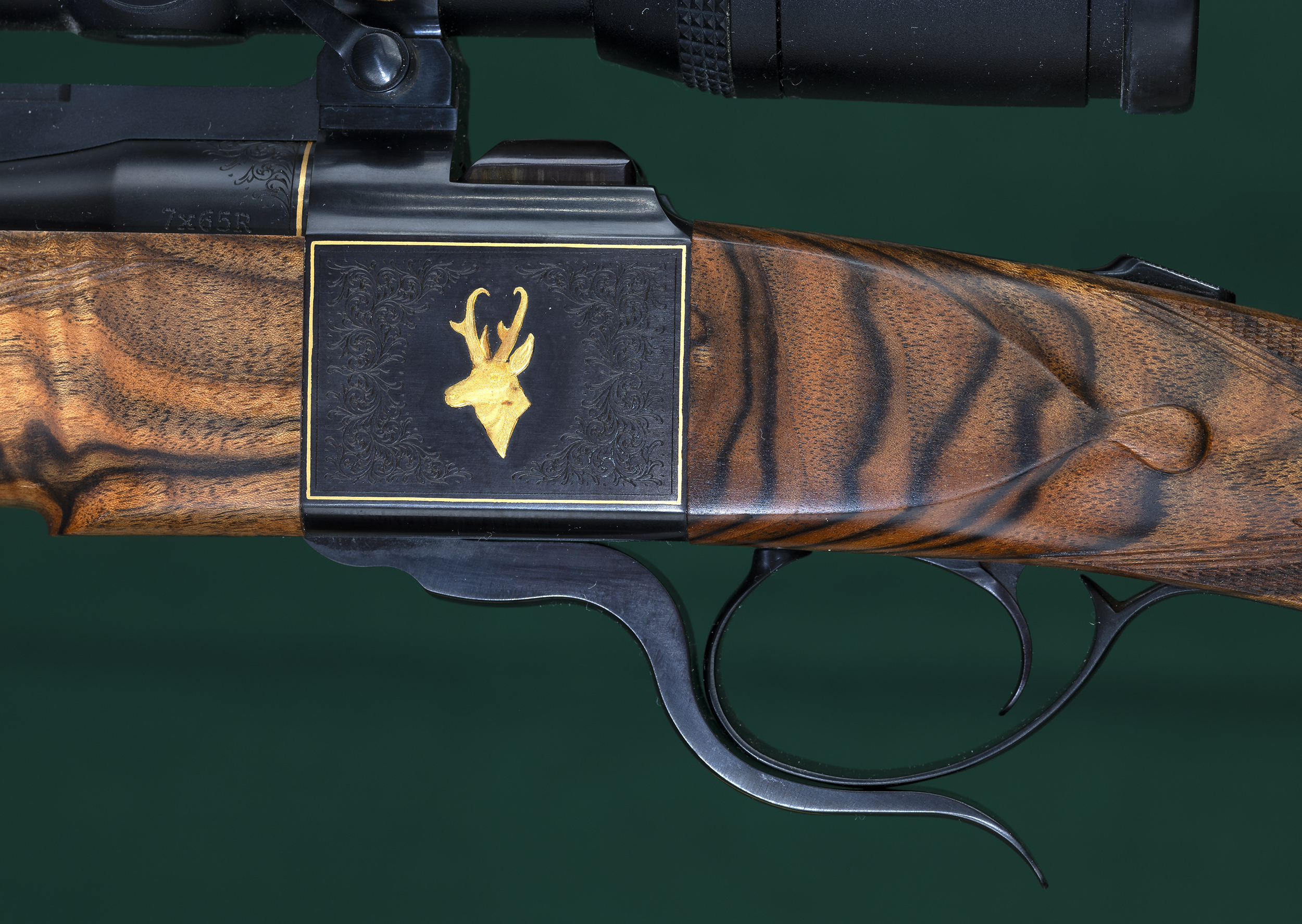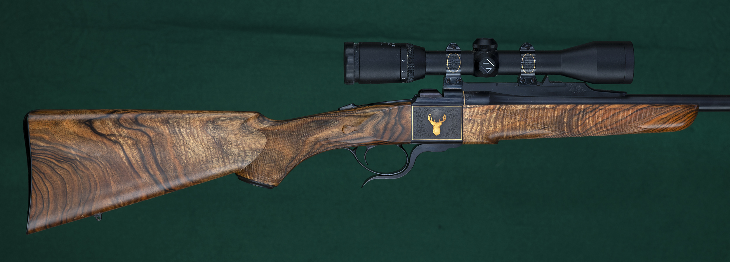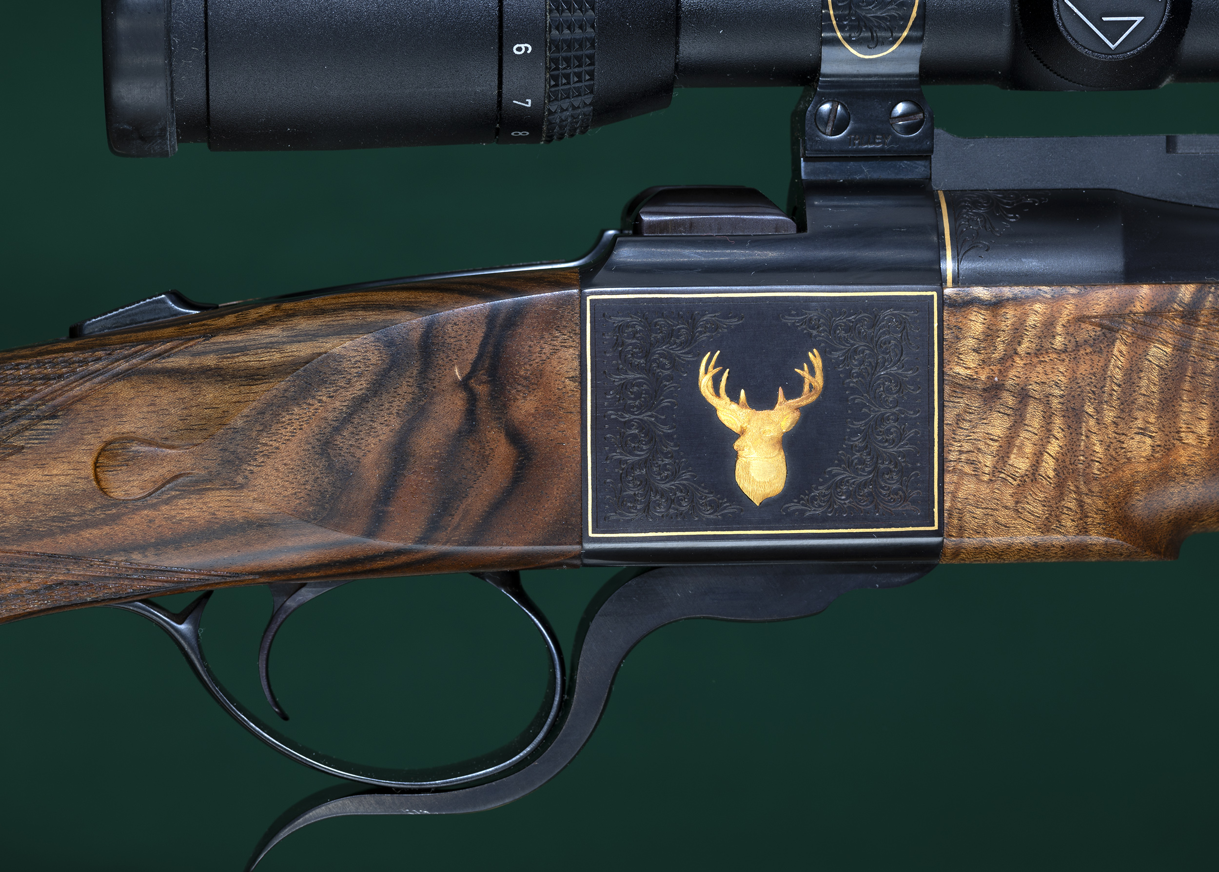| mule deer buck on right, English rose & scroll on buttplate, and fine gold |