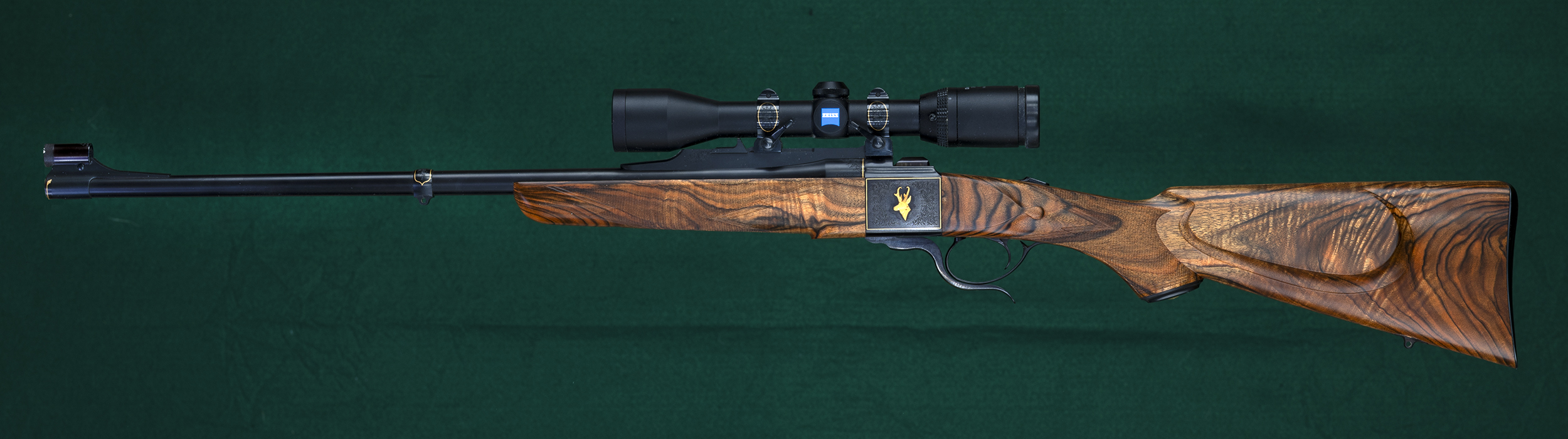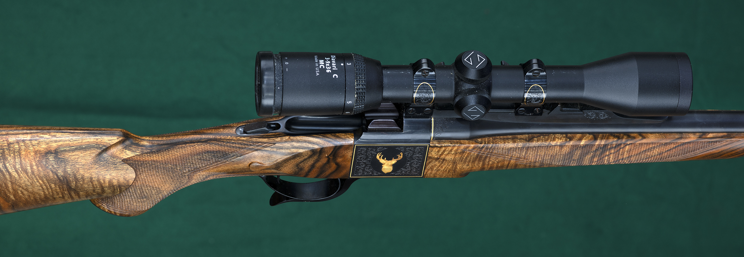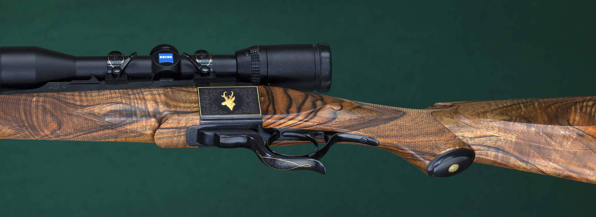 | buttplate. Zeiss Diavari 3-9x36 MC scope on engraved Talley rings the front |