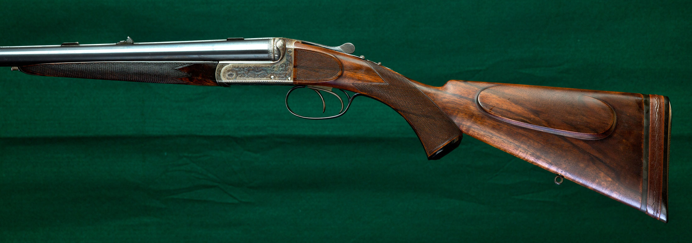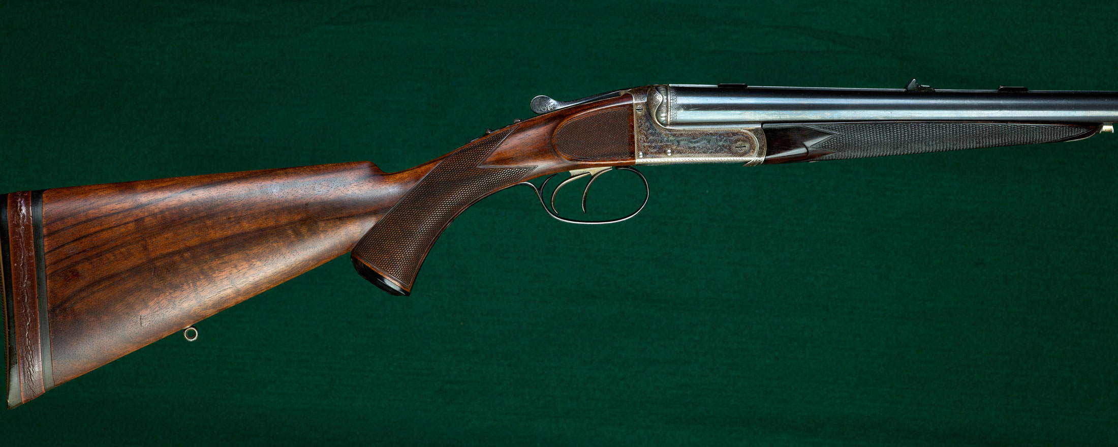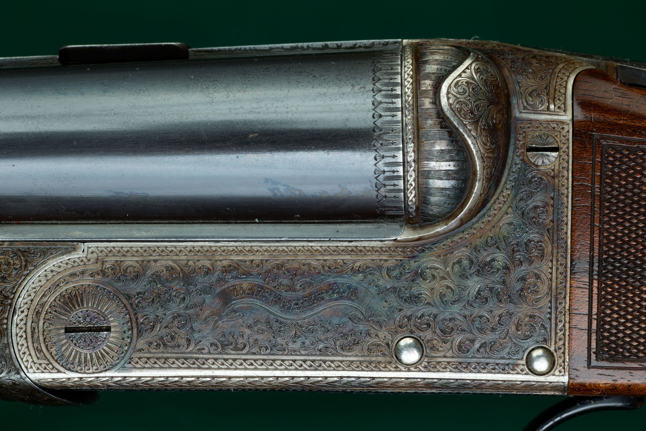 27" SxS barrels with extended muzzles, flat, hand-matted rib, raised fine bead front sight with platinum inlaid levelling line, 1 standing and 1 folding express sights engraved for 100 and 200 yards. Figured walnut stock with Anson-pushbutton-release splinter forend, capped pistol grip, beaded pancake cheekpiece, classic point-pattern checkering, checkered flat sidepanels, sling eye and compound India rubber and checkered black hardrubber recoil pad. Full coverage, rope-bordered, fine scroll engraved boxlock action with scalloped fences, intercepting sears, active doll's head third fastener, double triggers, bushed firing pins, long bottom tang, automatic top tang bolted safety with SAFE inlaid in gold, BOLTED inlaid in platinum and FIRE indicated with red cloissonne enamel. Pull: 14 1/4". Weight: 8lbs, 15oz. London black powder proofs. Built ca 1891. Retaining 99% original blue throughout and 95% casehardening colors. Tight. And, with excellent bores.