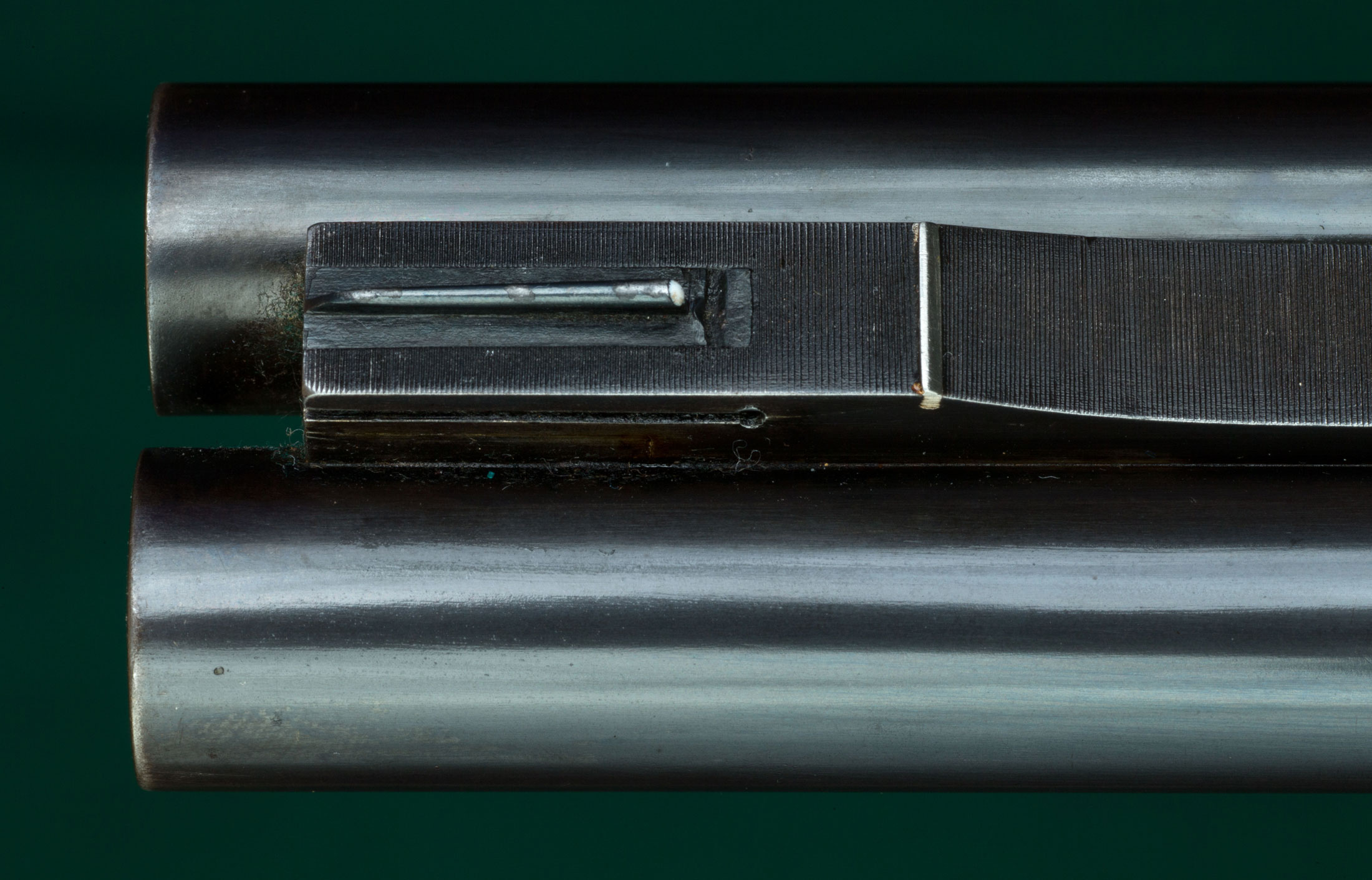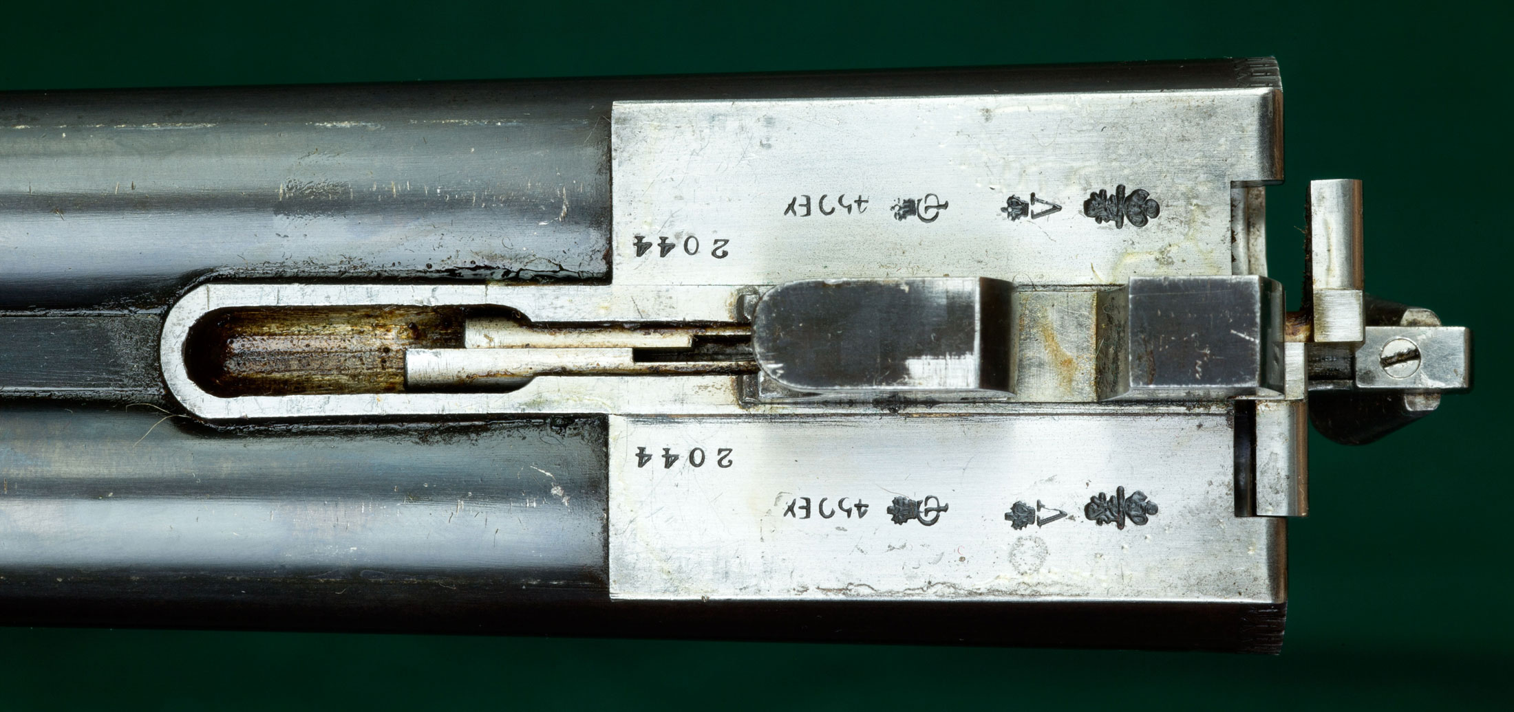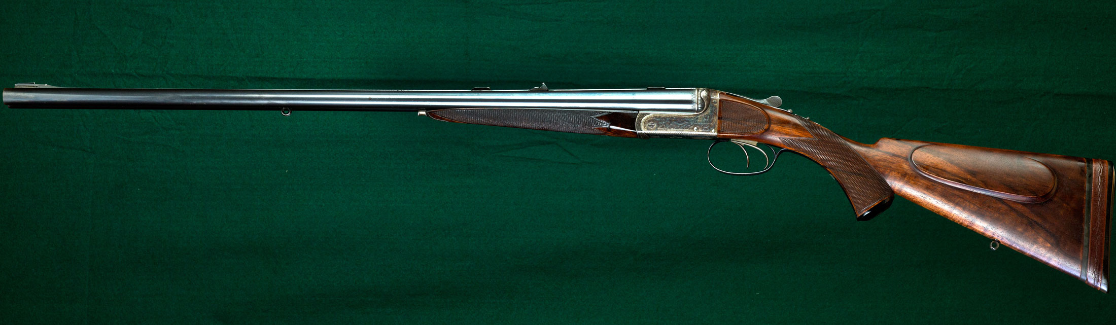 27" SxS barrels with extended muzzles, flat, hand-matted rib, raised fine bead front sight with platinum inlaid levelling line, 1 standing and 1 folding express sights engraved for 100 and 200 yards. Figured walnut stock with Anson-pushbutton-release splinter forend, capped pistol grip, beaded pancake cheekpiece, classic point-pattern checkering, checkered flat sidepanels, sling eye and compound India rubber and checkered black hardrubber recoil pad. Full coverage, rope-bordered, fine scroll engraved boxlock action with scalloped fences, intercepting sears, active doll's head third fastener, double triggers, bushed firing pins, long bottom tang, automatic top tang bolted safety with SAFE inlaid in gold, BOLTED inlaid in platinum and FIRE indicated with red cloissonne enamel. Pull: 14 1/4". Weight: 8lbs, 15oz. London black powder proofs. Built ca 1891. Retaining 99% original blue throughout and 95% casehardening colors. Tight. And, with excellent bores.
