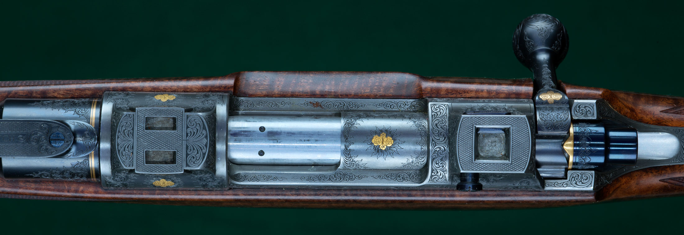 Description: 22 1/2" tapered round Lilja barrel with ramp front sight, pedestal-mounted sling eye, quarter rib, one standing and two folding express sights gold-lined and engraved for 50, 75 and 100 yards. Stocked by Darwin Hensley with dense, dark exhibition walnut, with ebony forend tip, fine wrap-around point-pattern checkering with mullered borders, steel trapdoor pistol grip cap, pedestalled rear sling eye, beaded pancake cheekpiece and steel buttplate. Extensively reshaped Model 52B action by Steve Heilmann: ejection port opened to replicate a Mauser Kurz Double Squarebridge, shotgun triggerguard, extended top tang, hinged straddle floorplate with release inside triggerguard concealing removable 5-shot magazine, sculptured trigger and bolt knob and top tang safety with SAFE and FIRE inlaid in gold. Extensively engraved by Terry Wallace with English rose and scroll---the roses inlaid in gold---on receiver, floorplate, grip cap, buttplate, quarter rib, rings and sights. Finish work by Pete Mazur. Petite Noske scope with fine crosshair reticle on shaped and engraved quick-detachable claw mounts fitted to a dovetail through the front squarebridge and, in Mauser factory sporter style, directly to the rear squarebridge with release-button built into the squarebridge. Pull 13 7/8". Weight: 8lbs, 2oz. New condition. In full-length ironwood and ostrich-hide case with two engraved white-handled turnscrews, cleaning rod and brush, and three white-inlaid engraved brass oil and patch bottles. Winner of the 1998 Guns Magazine Award of Excellence for Terry Wallace's engraving.