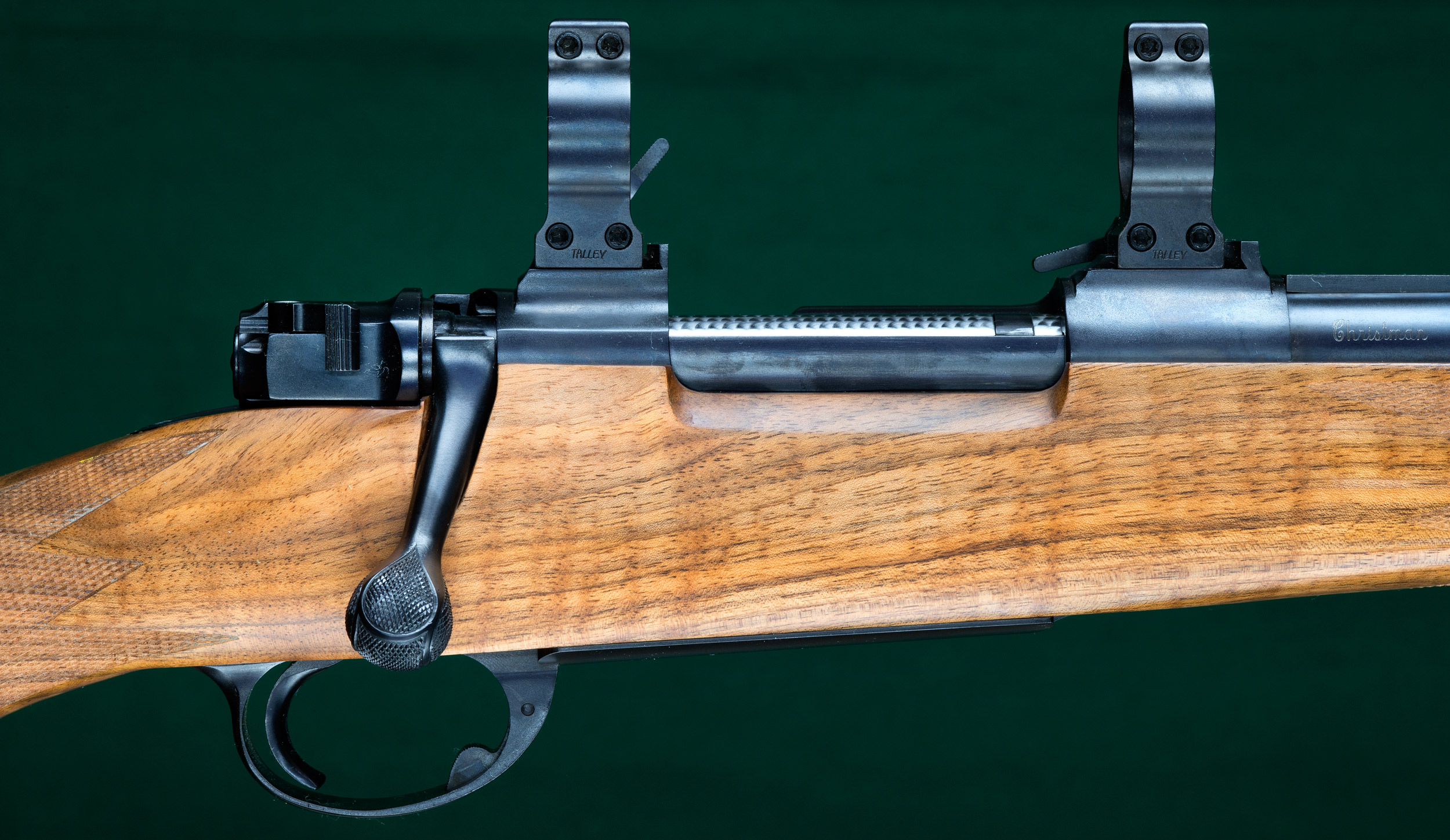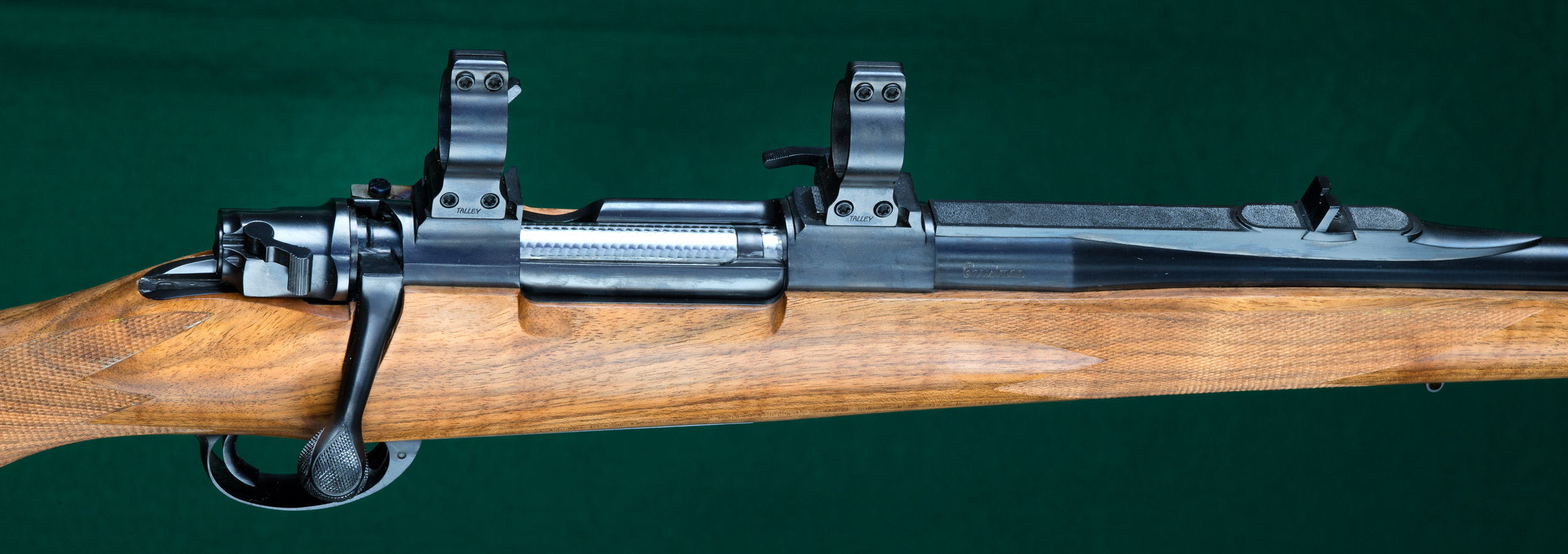 | inside triggerguard. Talley 1" quick-detachable rings fitted directly to |