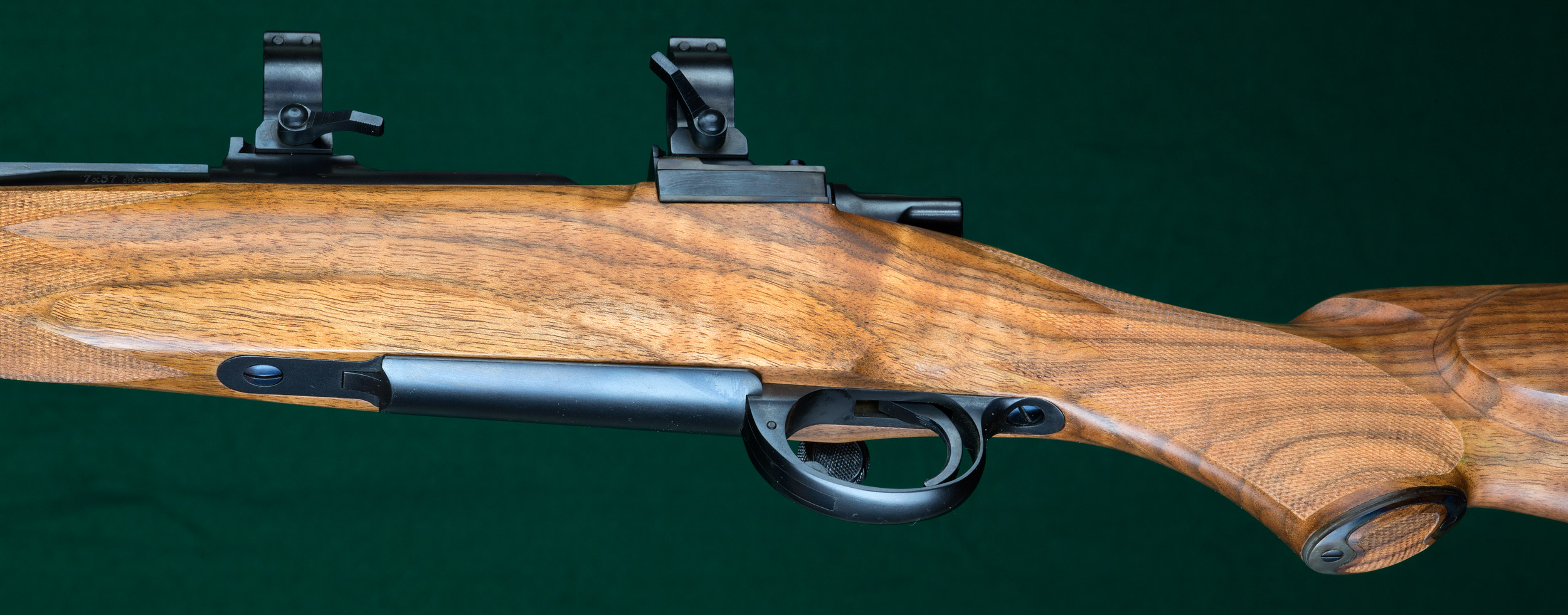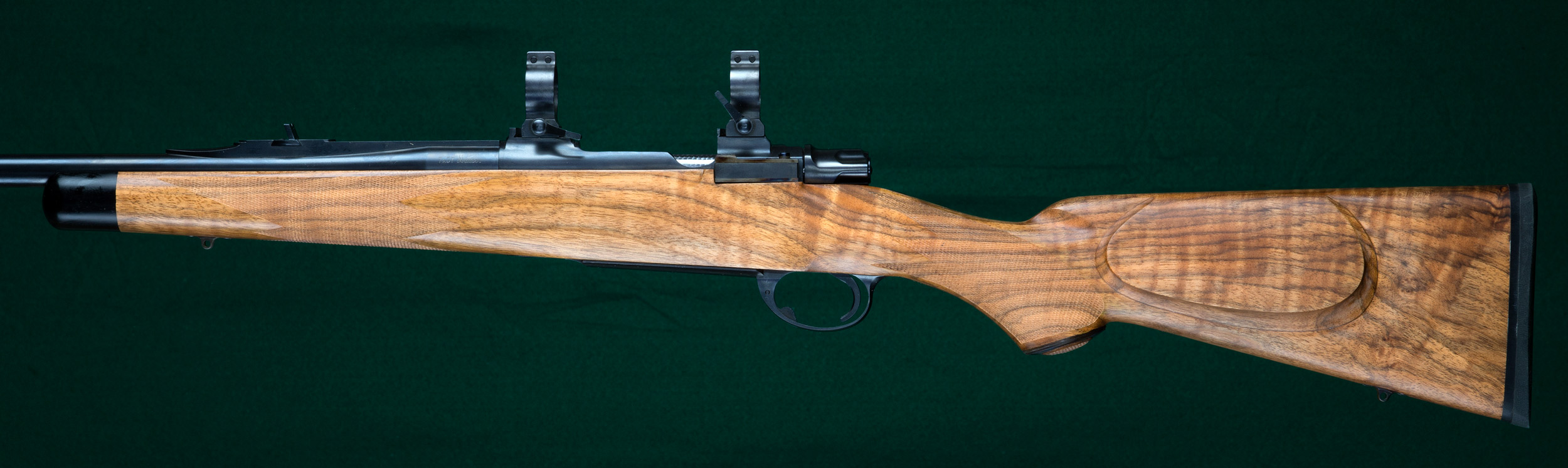 | figured European walnut stock with ebony forend tip, classic borderless |